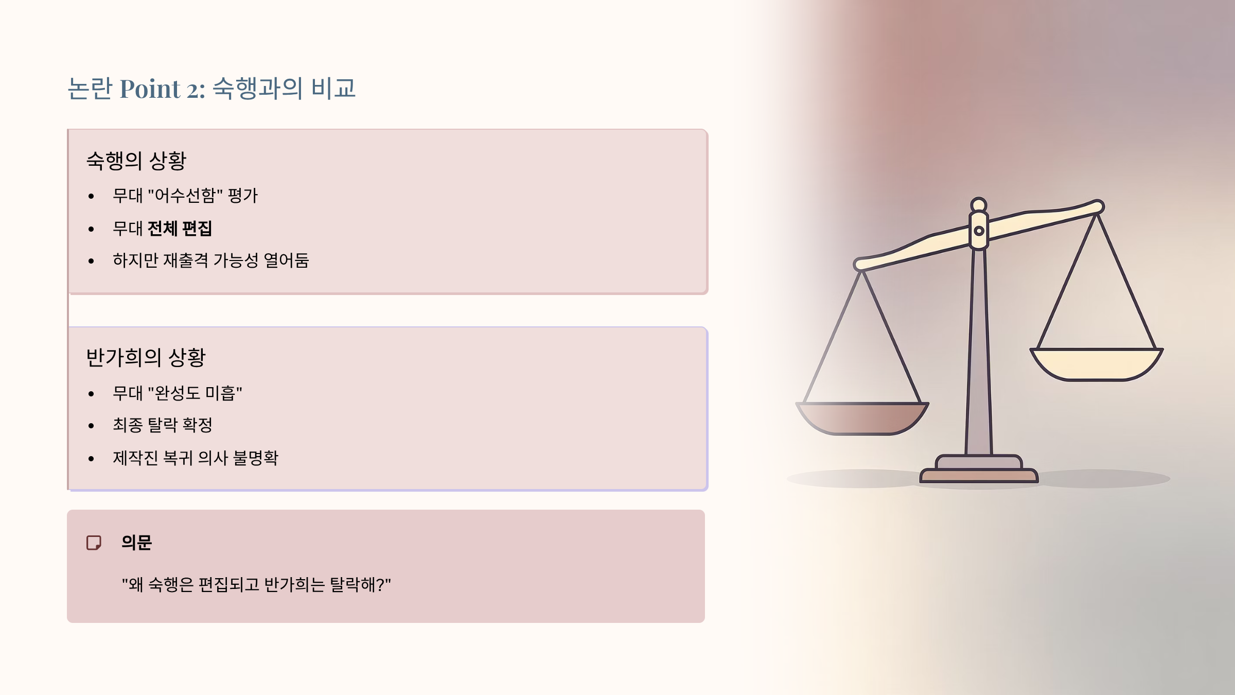 - 숙행의 편집과의 비교: 숙행은 무대 전체 편집 후 재출격 가능한데, 반가희는 탈락?