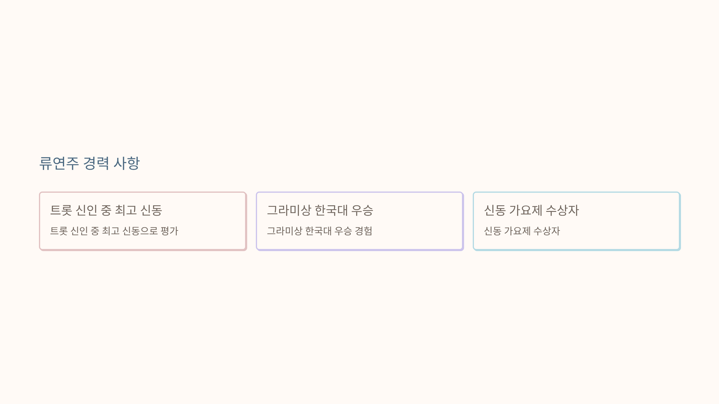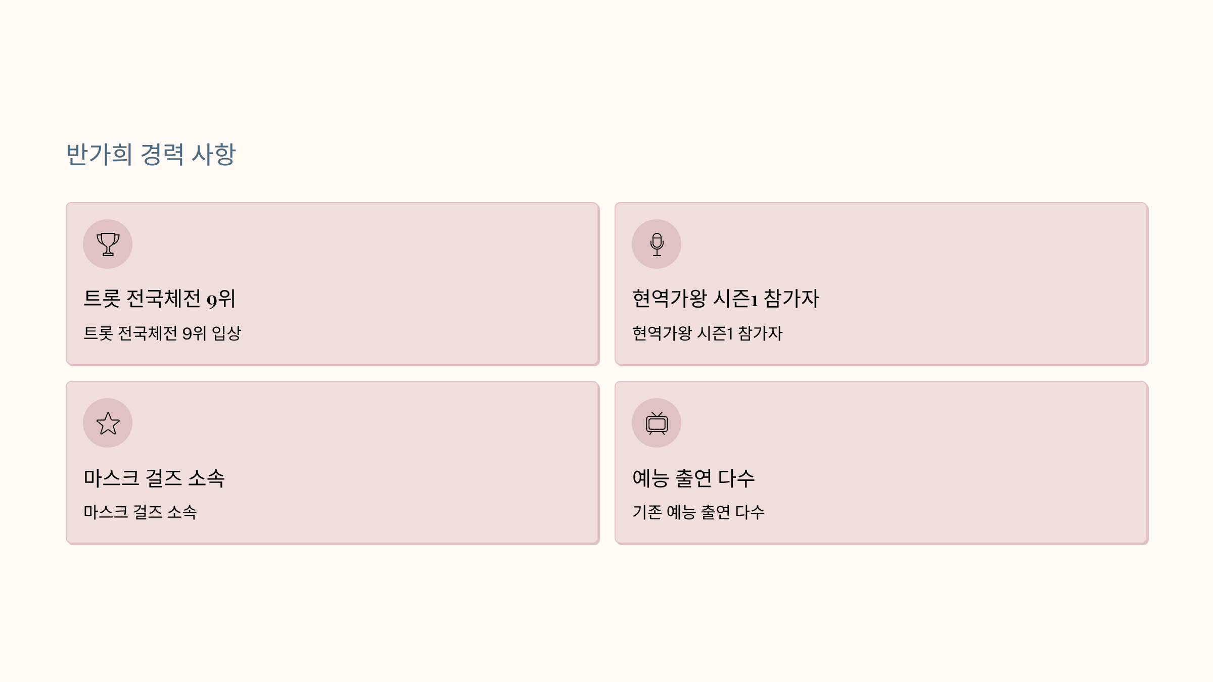- 특징: 불타는 장미단 신동 가요제 우승자