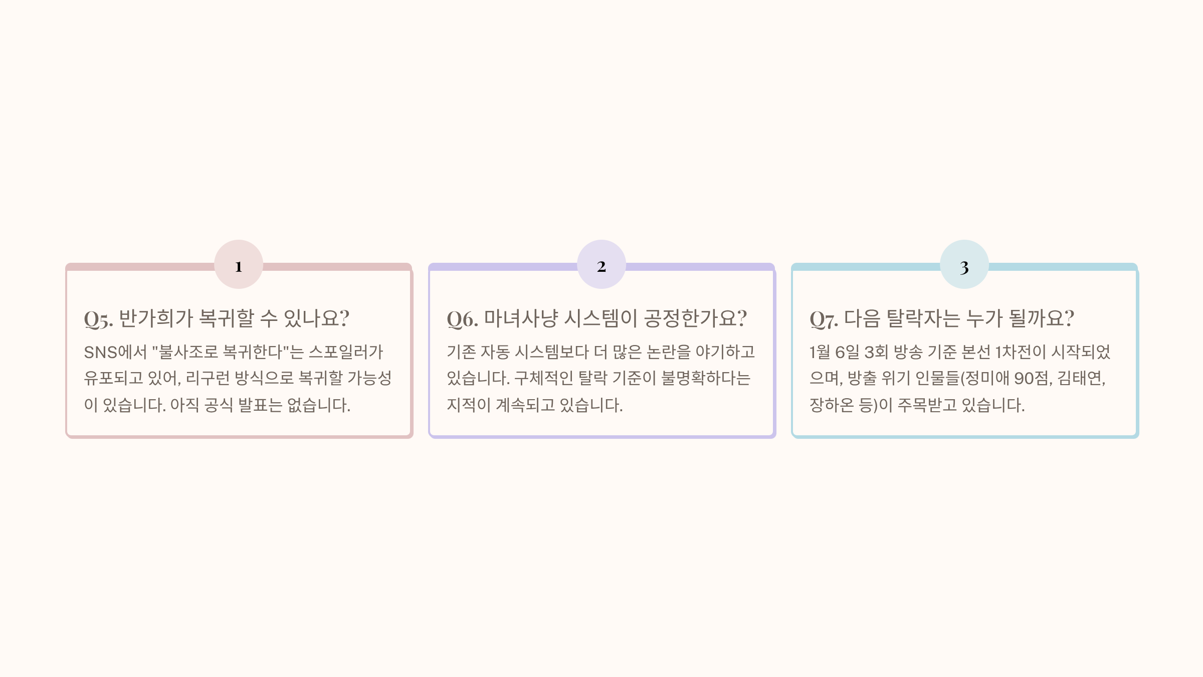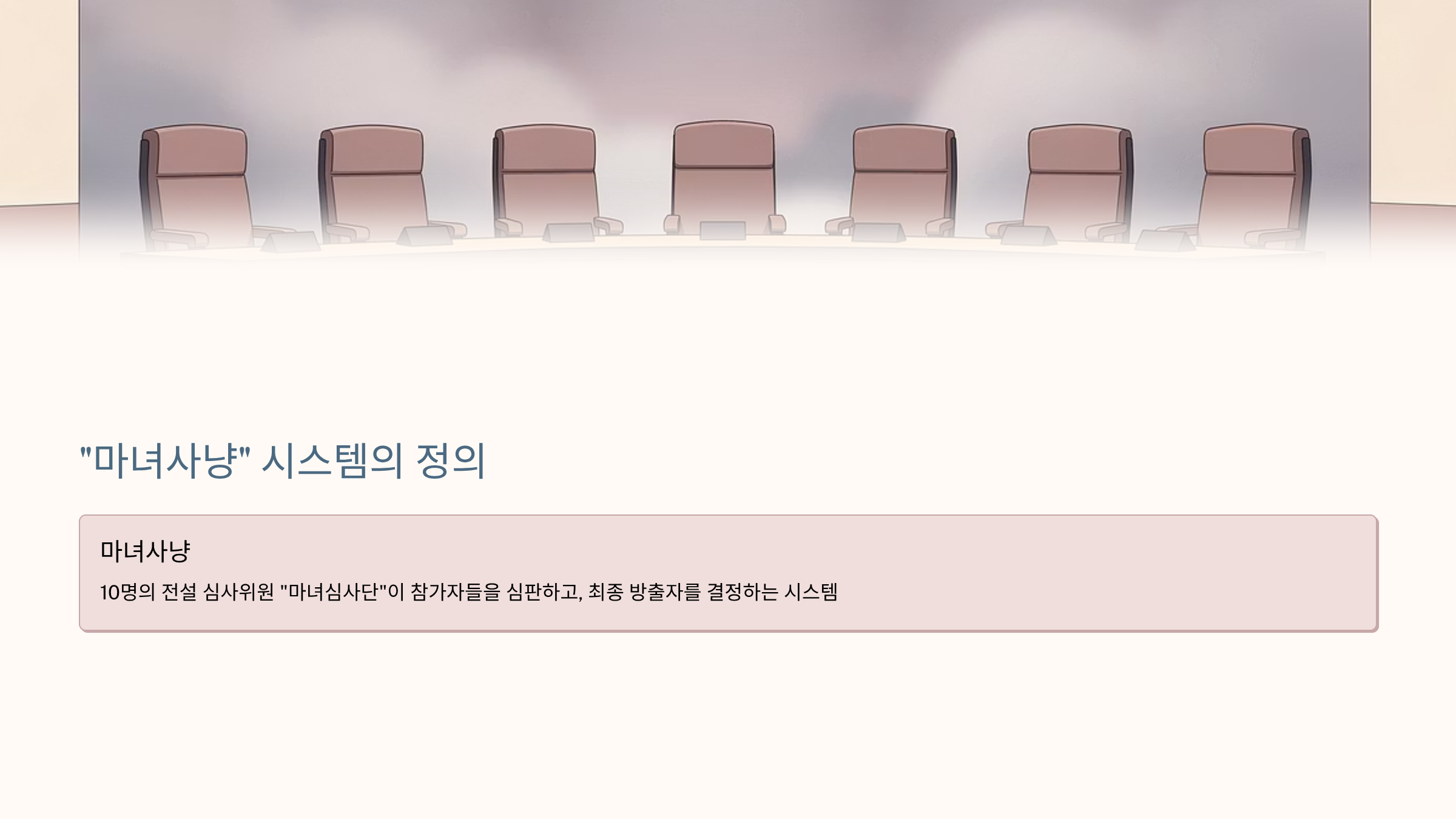 - 새로운: 심사위원 채점 → 방출 후보 결정 → 마녀심사단 투표 → 최종 탈락