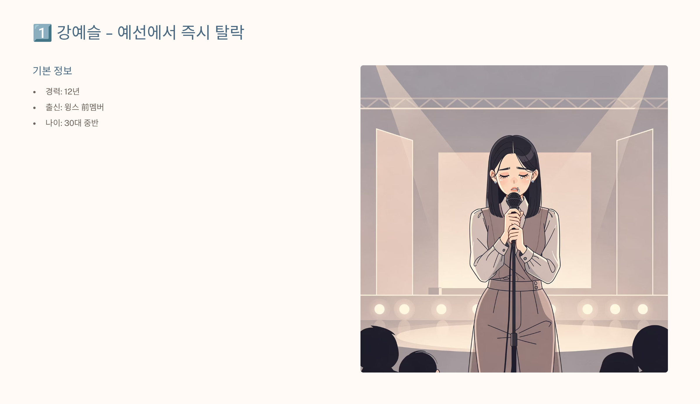 | 강예슬 | 12년 | 0점 | 즉시 탈락 | ⭐ | 최악의 성적 |
