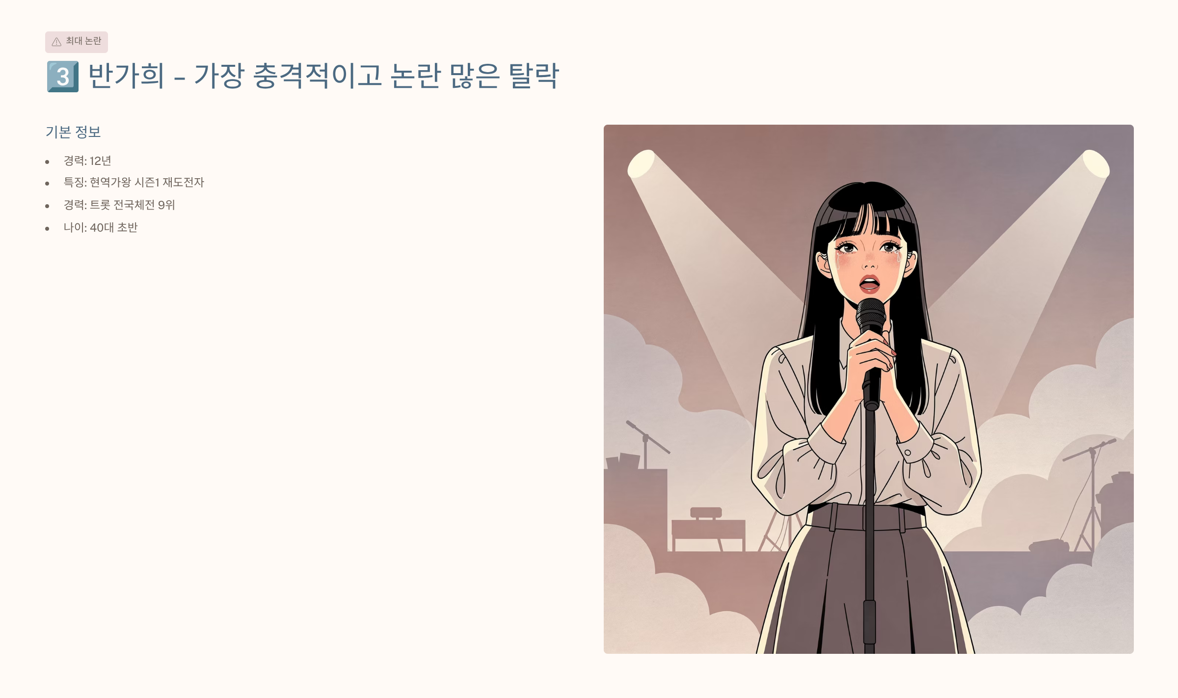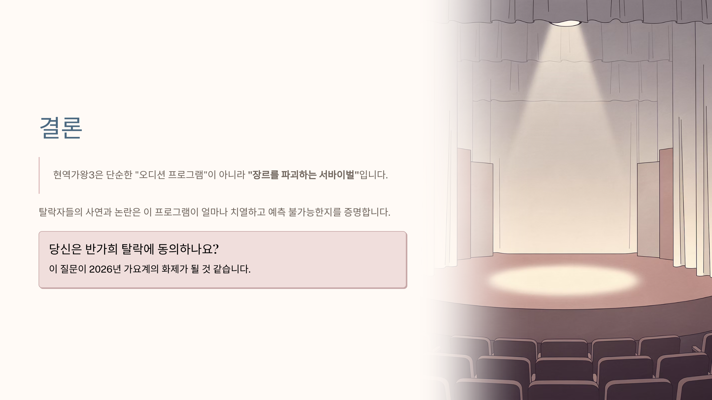 현역가왕3은 단순한 "오디션 프로그램"이 아니라 **"장르를 파괴하는 서바이벌"**입니다. 탈락자들의 사연과 논란은 이 프로그램이 얼마나 치열하고 예측 불가능한지를 증명합니다.