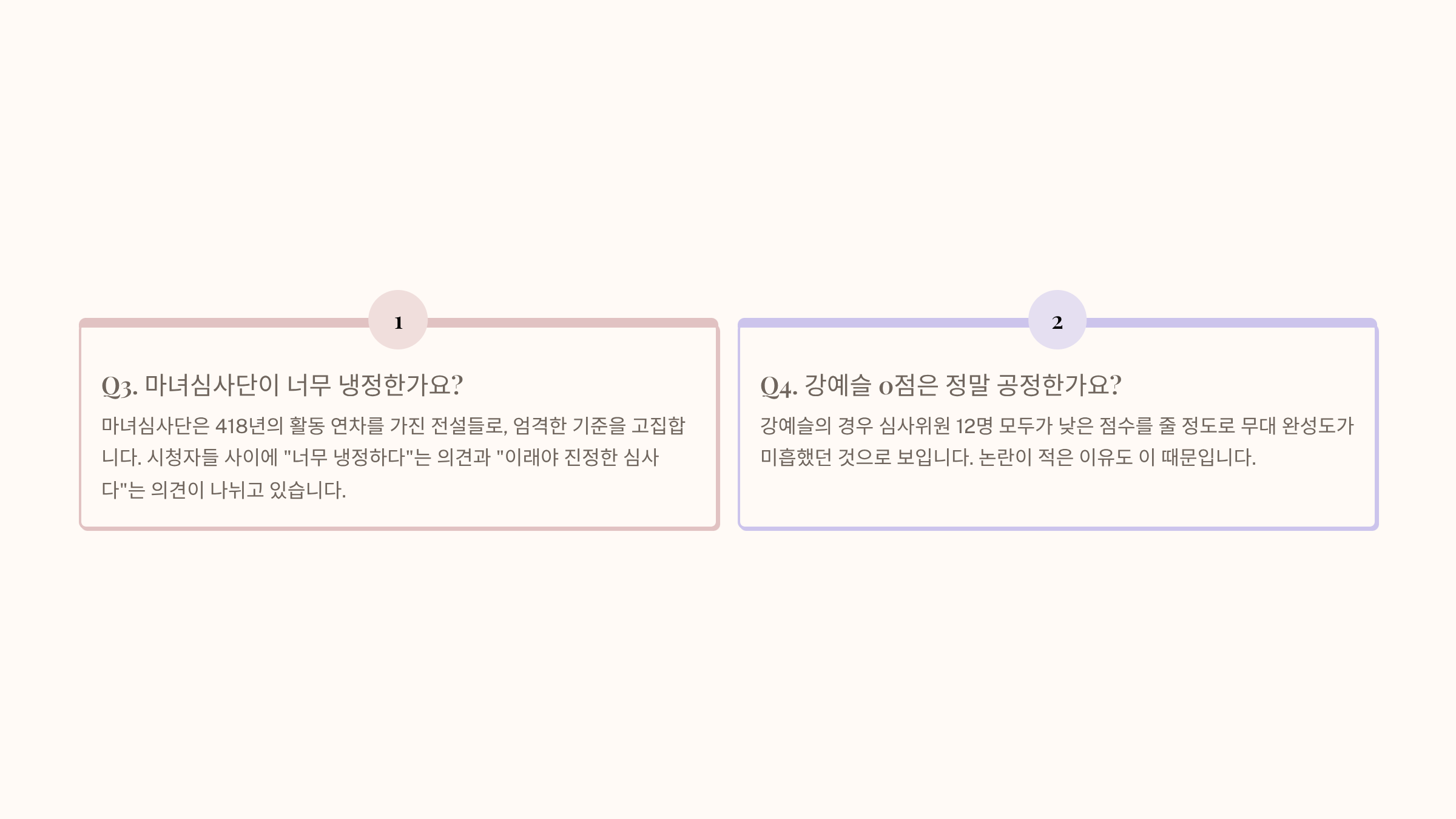 A. 마녀심사단은 418년의 활동 연차를 가진 전설들로, 엄격한 기준을 고집합니다. 시청자들 사이에 "너무 냉정하다"는 의견과 "이래야 진정한 심사다"는 의견이 나뉘고 있습니다.