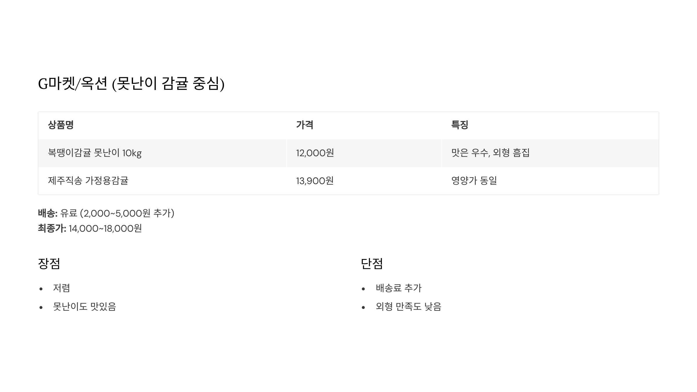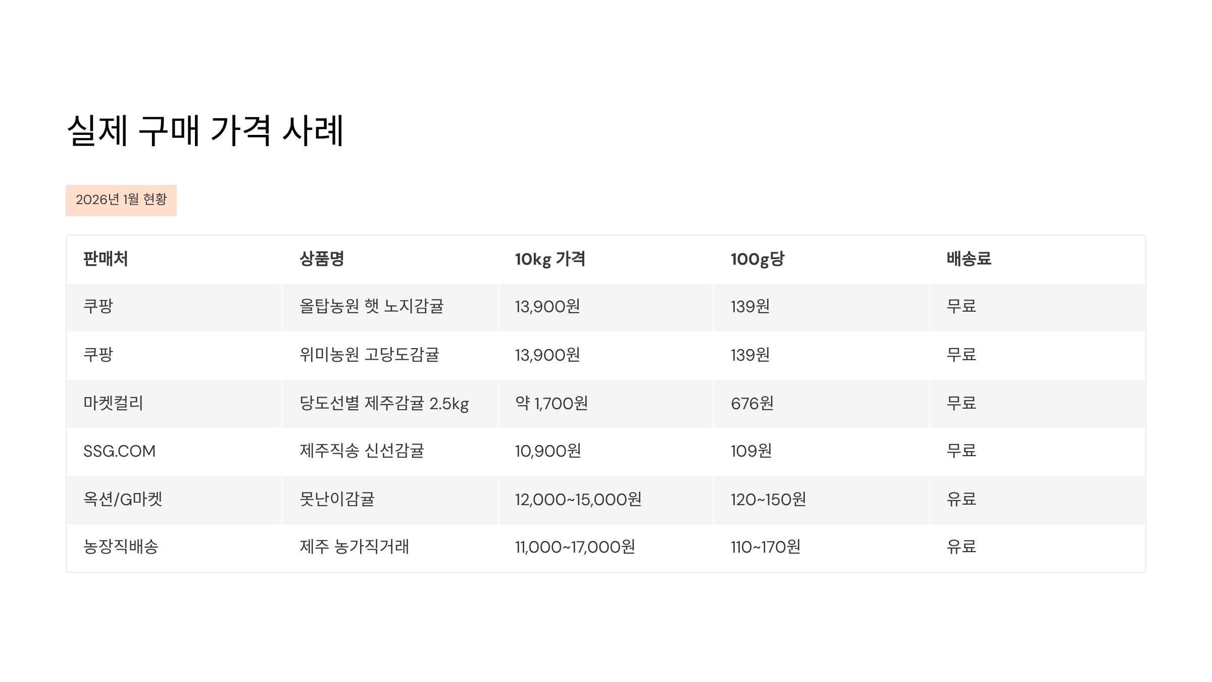 | 제주 노지감귤 농가 | 조생귤 10kg | 13,000~15,000원 | 가장 신선 | 4,000~6,000원 |