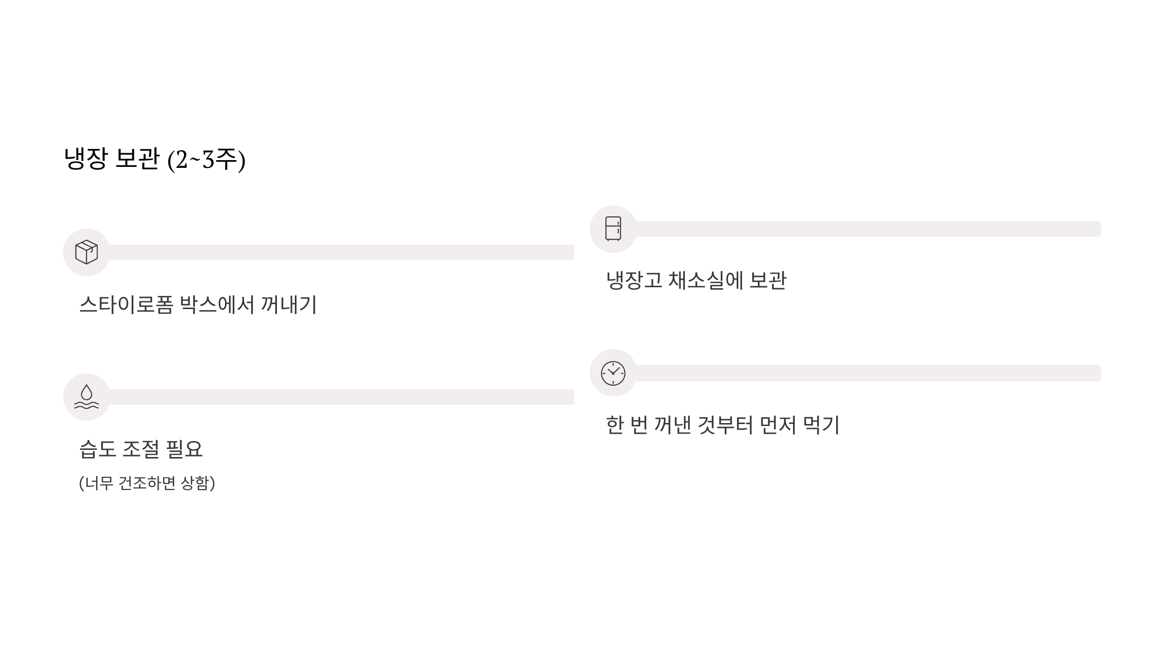 - 습도 조절 필요 (너무 건조하면 상함)