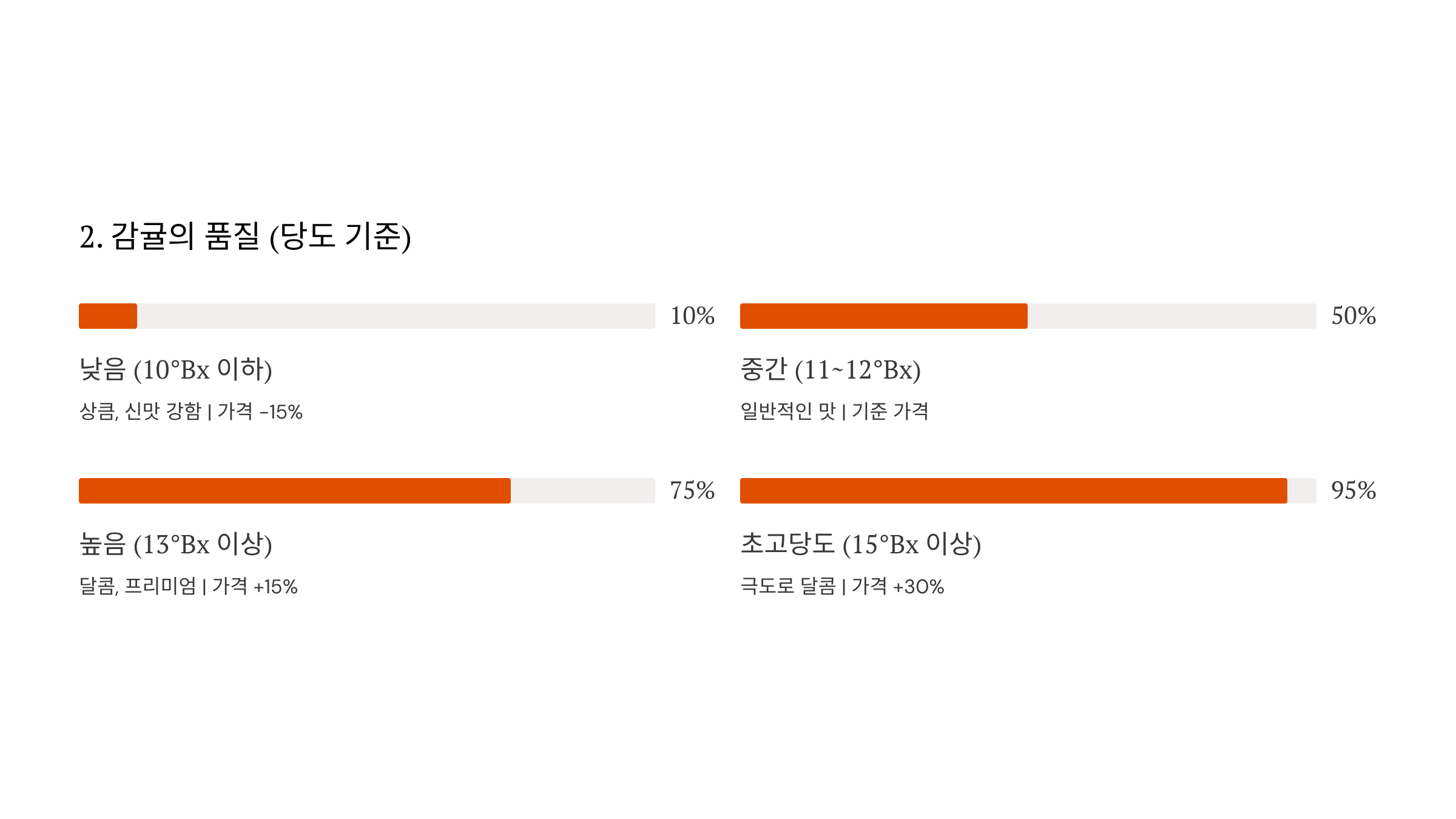 | 높음 | 13°Bx 이상 | 달콤, 프리미엄 | +15% |