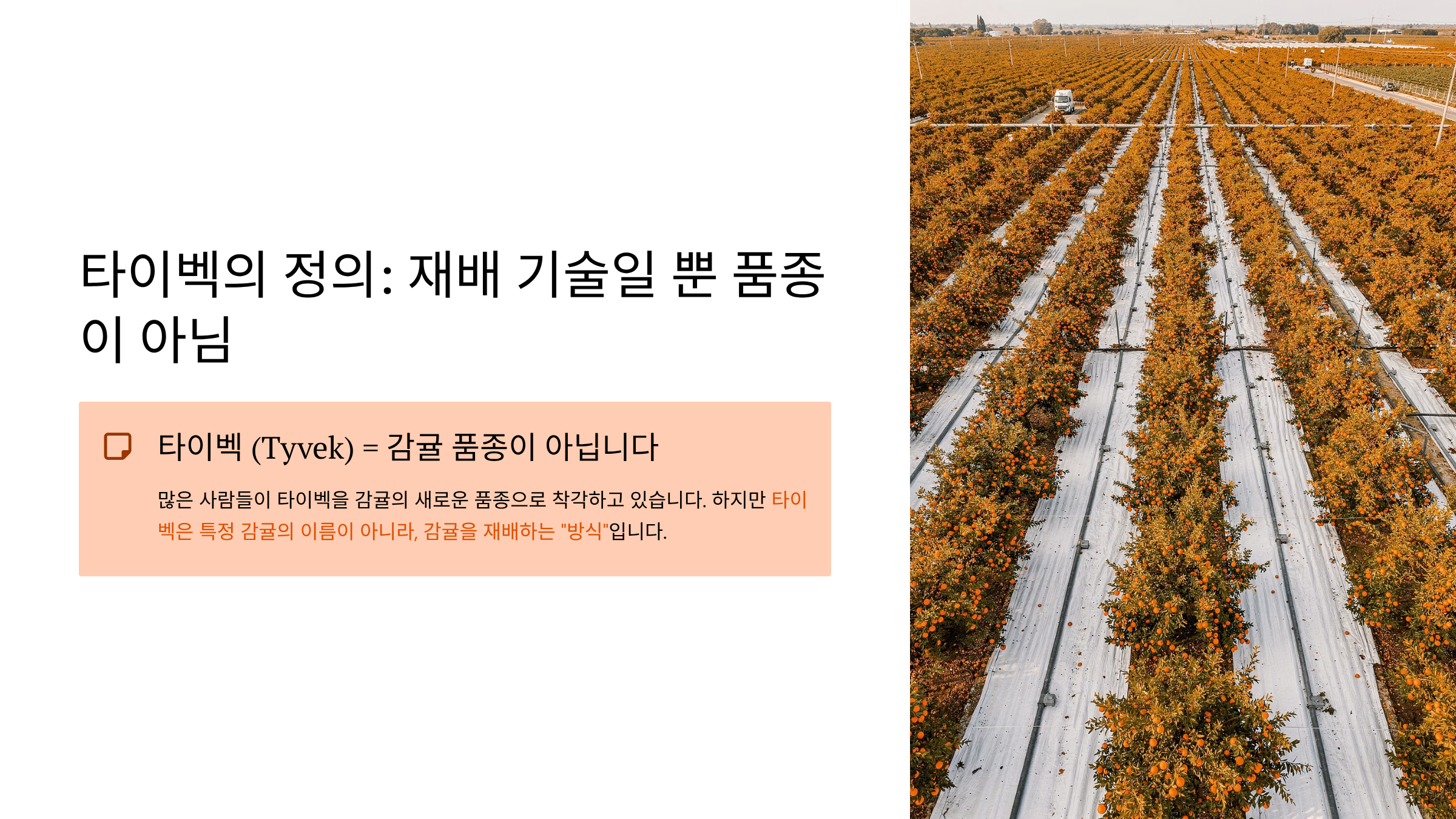 많은 사람들이 타이벡을 감귤의 새로운 품종으로 착각하고 있습니다. 하지만 타이벡은 특정 감귤의 이름이 아니라, 감귤을 재배하는 "방식"입니다.