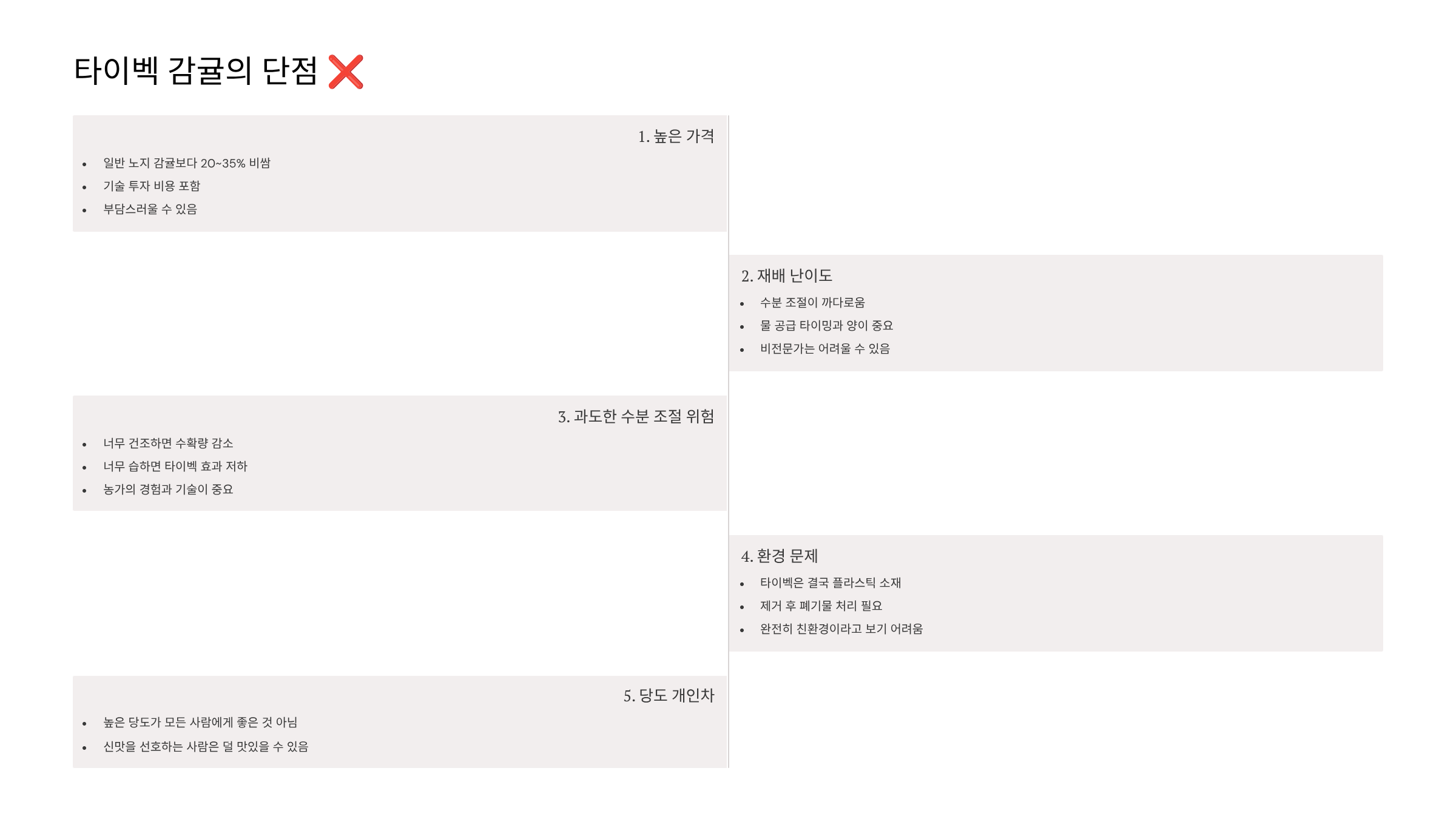 A. 초기 투자 비용이 크기 때문입니다. 타이벡 소재비, 설치비, 관리 비용 등이 일반 재배에 비해 훨씬 많이 듭니다. 일부 농가만 선택적으로 도입하고 있습니다.