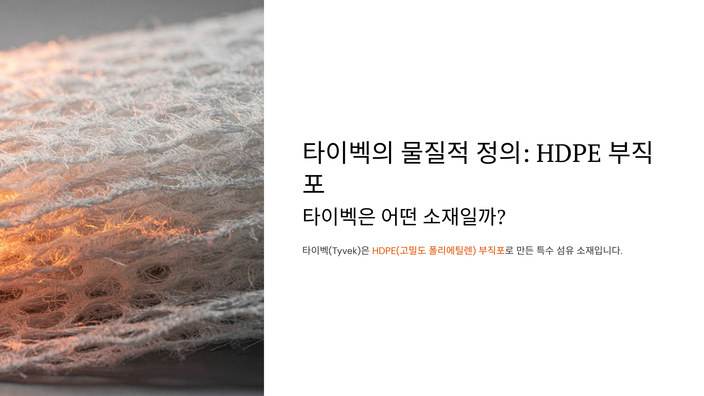 타이벡(Tyvek)은 HDPE(고밀도 폴리에틸렌) 부직포로 만든 특수 섬유 소재입니다.