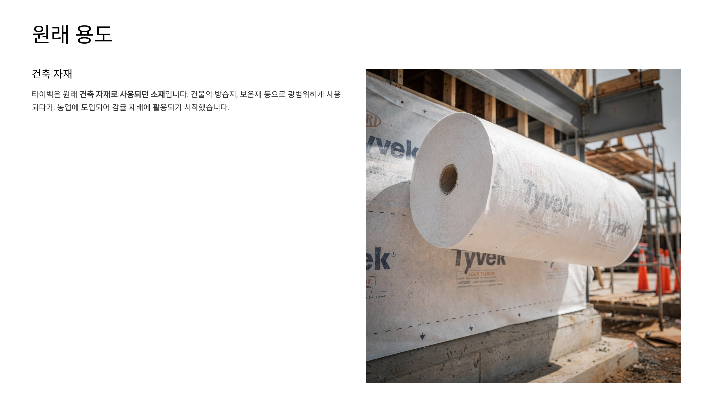 타이벡은 원래 건축 자재로 사용되던 소재입니다. 건물의 방습지, 보온재 등으로 광범위하게 사용되다가, 농업에 도입되어 감귤 재배에 활용되기 시작했습니다.