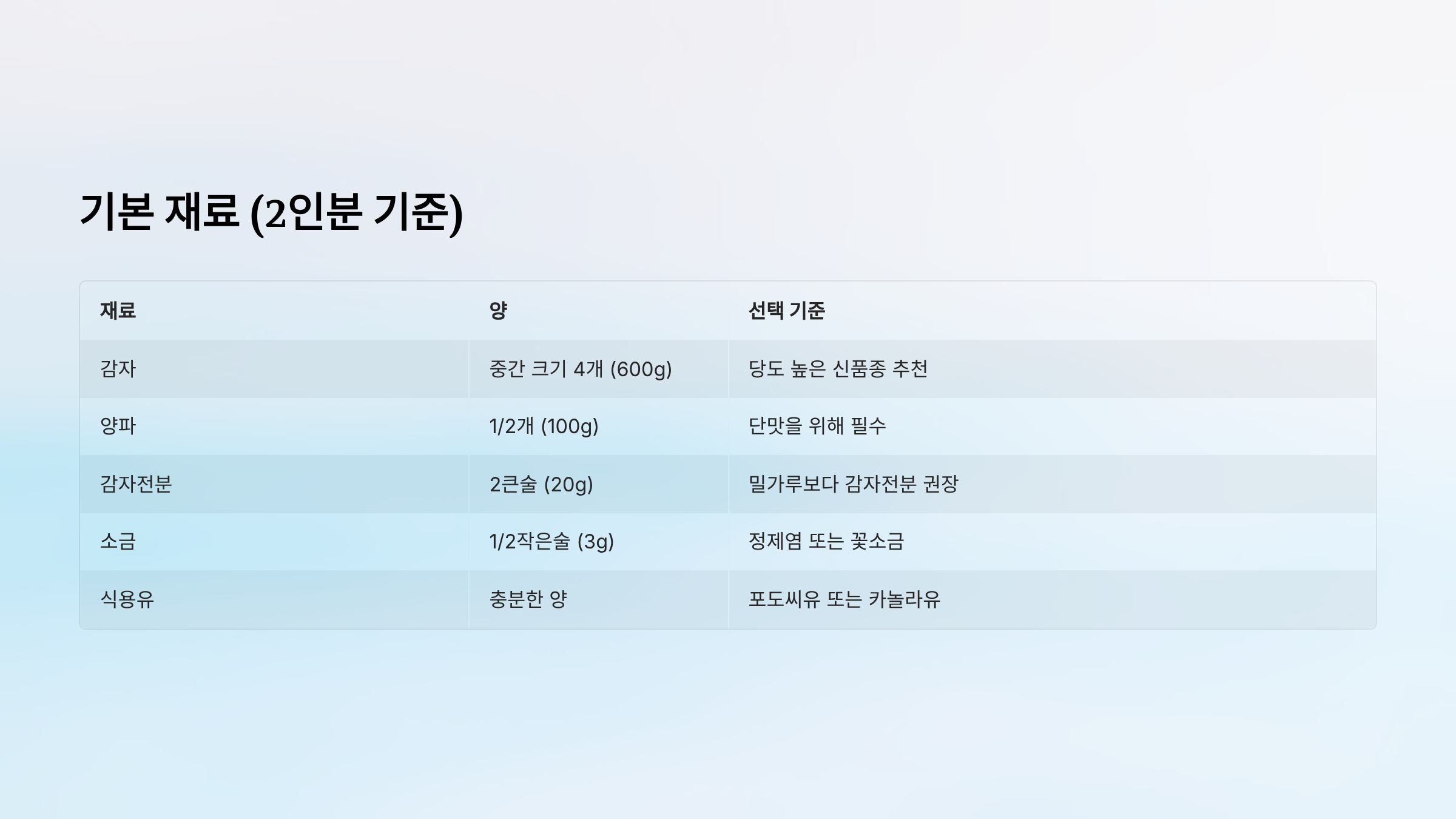 | 감자 | 중간 크기 4개 (600g) | 당도 높은 신품종 추천 |