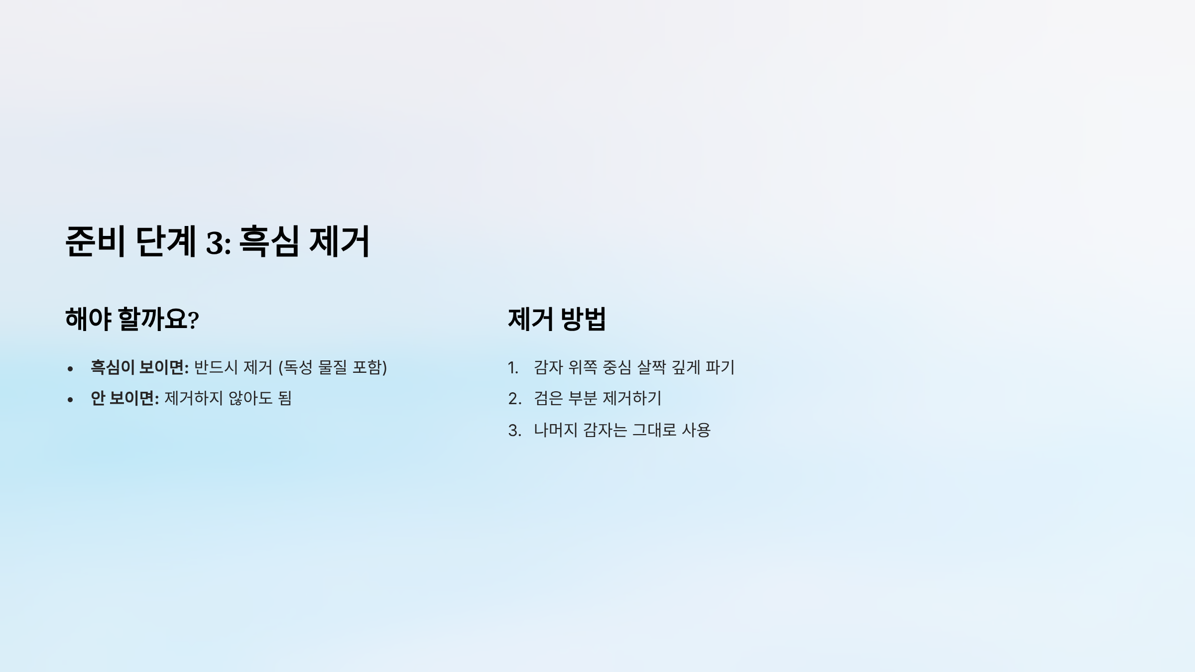 - 흑심이 보이면: 반드시 제거 (독성 물질 포함)