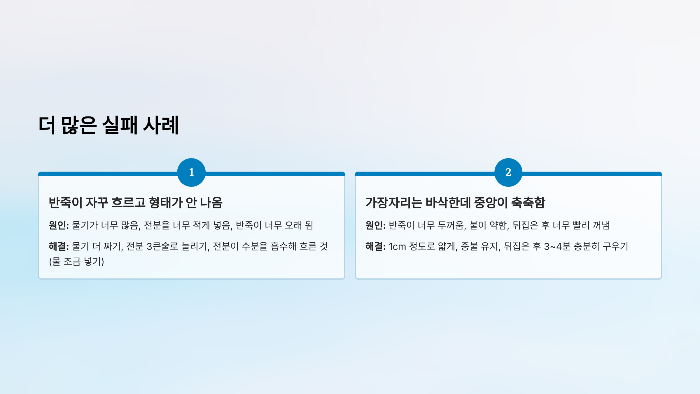 | 반죽이 너무 오래 됨 | 전분이 수분을 흡수해 흐른 것 (물 조금 넣기) |