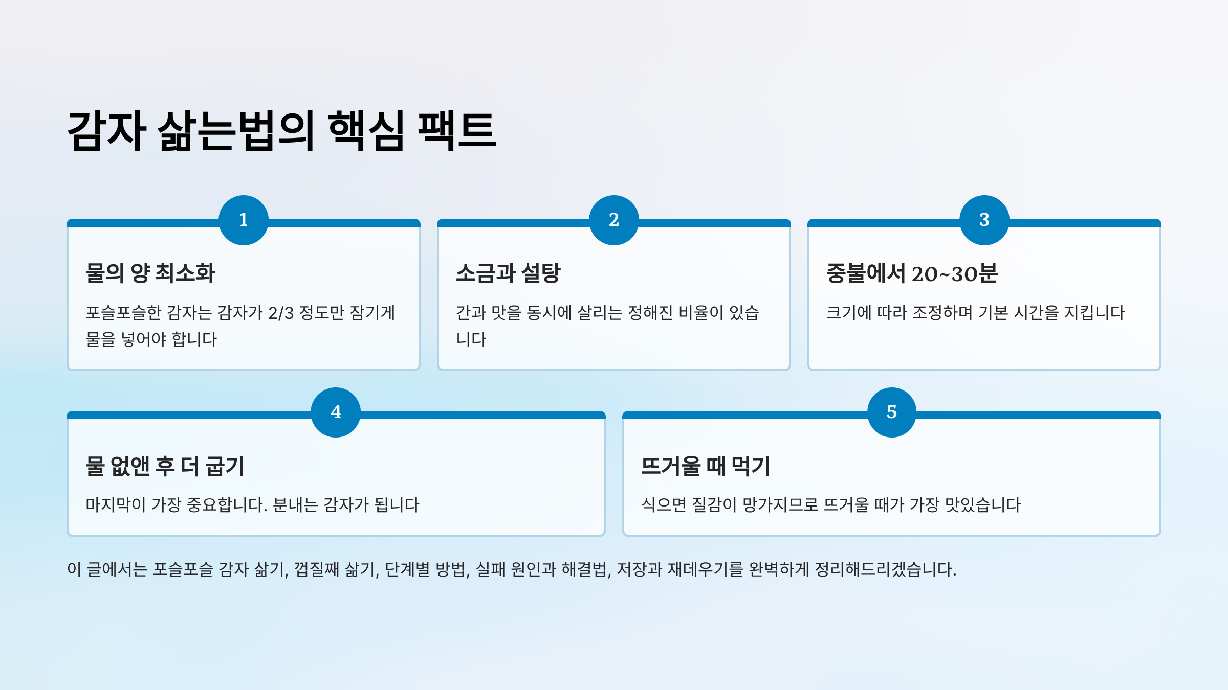 이 글에서는 포슬포슬 감자 삶기, 껍질째 삶기, 단계별 방법, 실패 원인과 해결법, 저장과 재데우기를 완벽하게 정리해드리겠습니다.