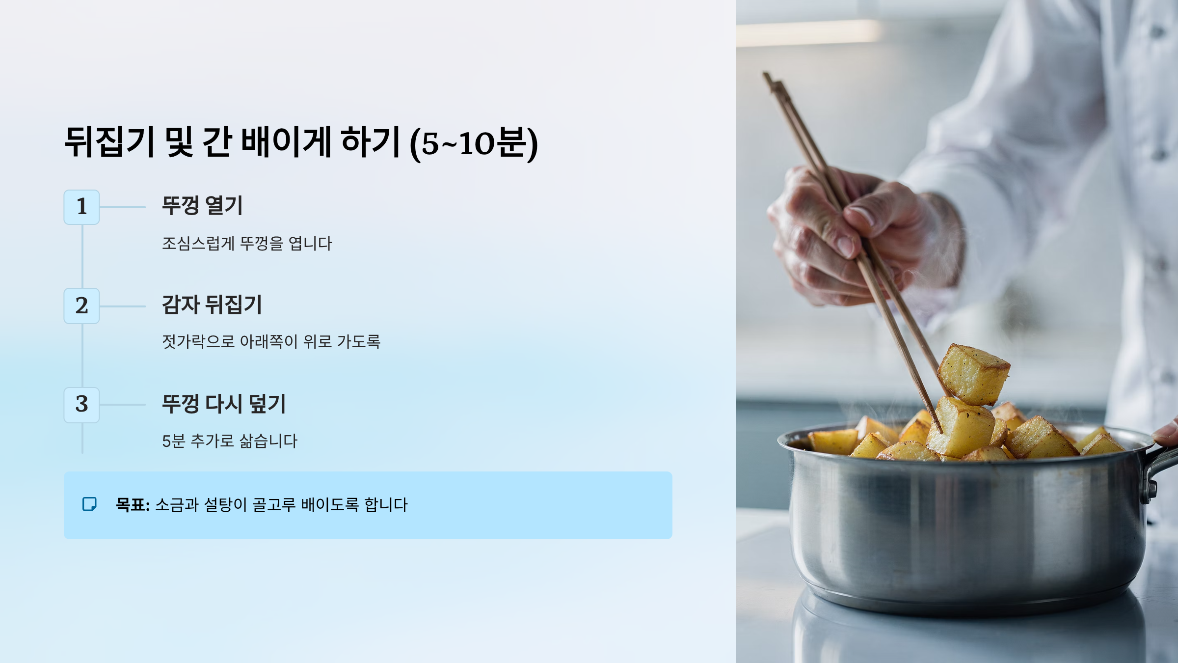 감자는 가장 간단해 보이지만 세심함이 필요한 요리입니다. 단순히 냄비에 넣고 물을 붓고 끓이는 것 같지만, 물의 양, 불의 세기, 시간, 양념의 분량이 모두 결과를 좌우합니다.