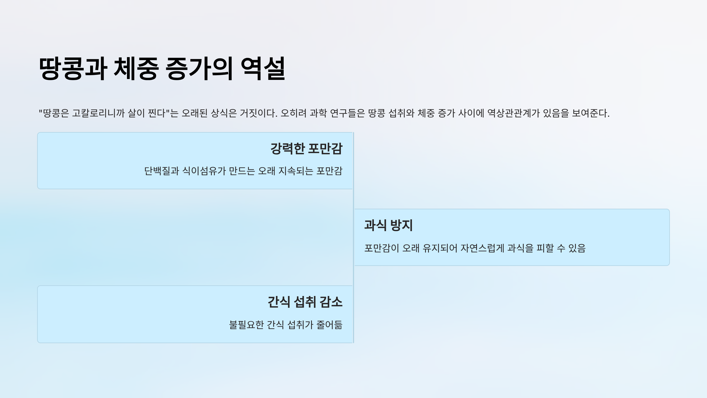 "땅콩은 고칼로리니까 살이 찐다"는 오래된 상식은 거짓이다. 오히려 과학 연구들은 땅콩 섭취와 체중 증가 사이에 역상관관계가 있음을 보여준다. 땅콩에 함유된 단백질과 식이섬유는 강력한 포만감을 만들어내기 때문이다. 포만감이 오래 유지되면 자연스럽게 과식을 피할 수 있고, 불필요한 간식 섭취도 줄어든다.
