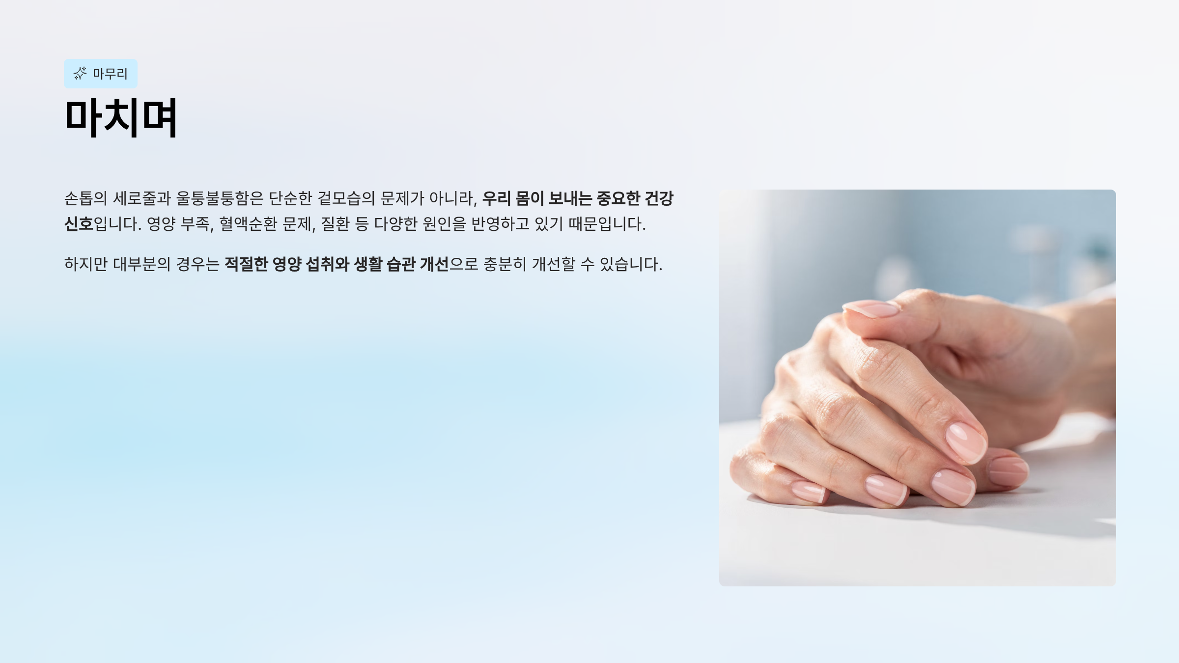 손톱의 세로줄과 울퉁불퉁함은 단순한 겉모습의 문제가 아니라, 우리 몸이 보내는 중요한 건강신호다. 영양 부족, 혈액순환 문제, 질환 등 다양한 원인을 반영하고 있기 때문이다. 하지만 대부분의 경우는 적절한 영양 섭취와 생활 습관 개선으로 충분히 개선할 수 있다.