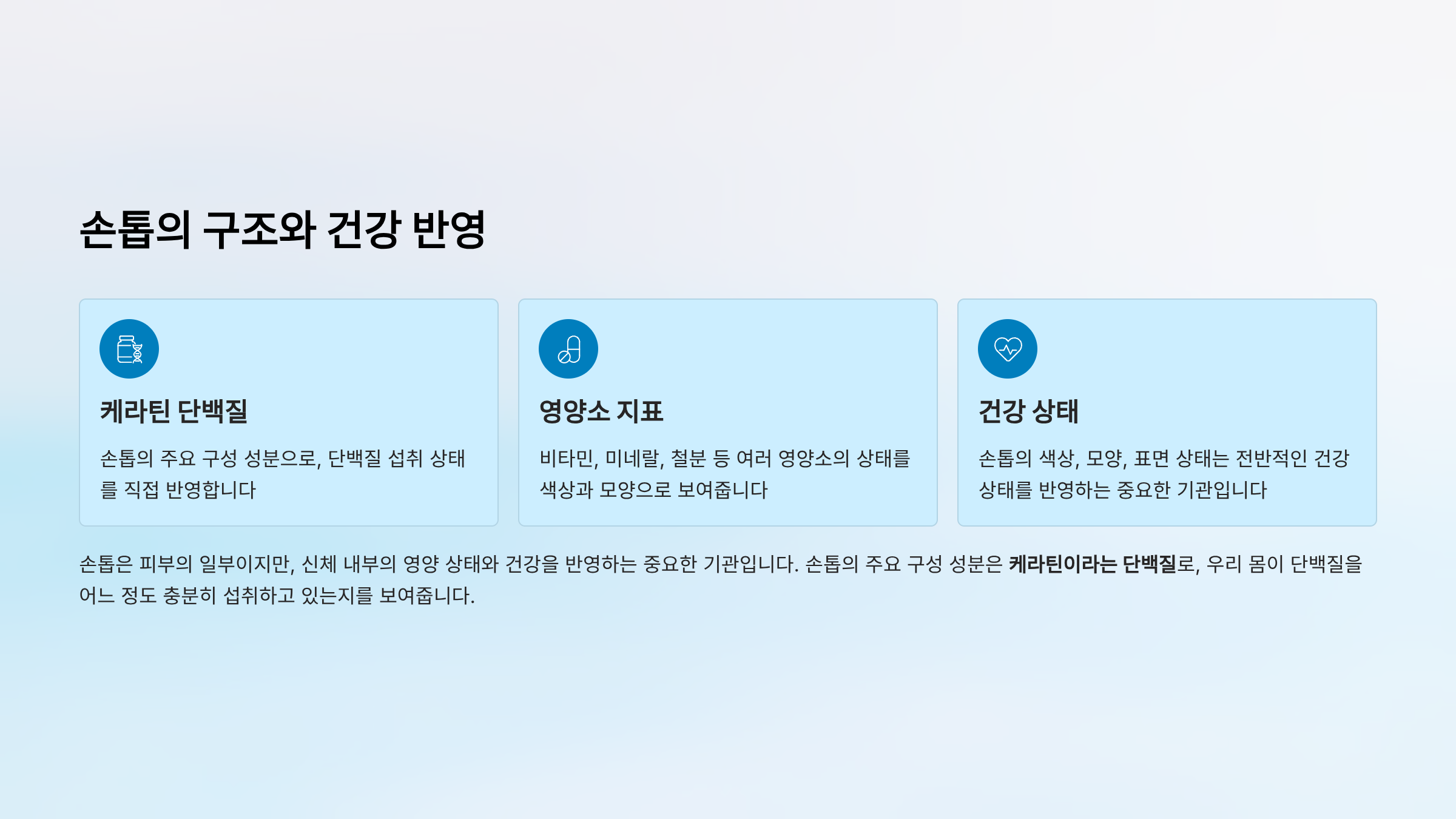 손톱은 피부의 일부이지만, 신체 내부의 영양 상태와 건강을 반영하는 중요한 기관이다. 손톱의 주요 구성 성분은 케라틴이라는 단백질로, 우리 몸이 단백질을 어느 정도 충분히 섭취하고 있는지를 보여준다. 또한 손톱의 색상, 모양, 표면 상태는 비타민, 미네랄, 철분 등 여러 영양소의 상태를 반영한다.