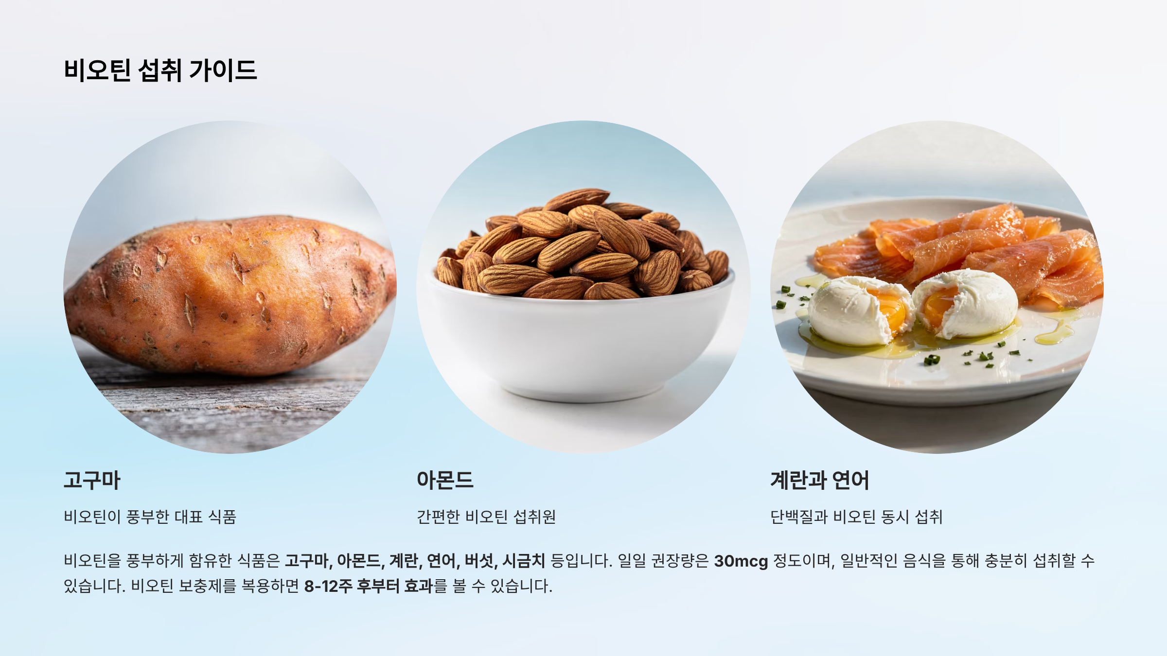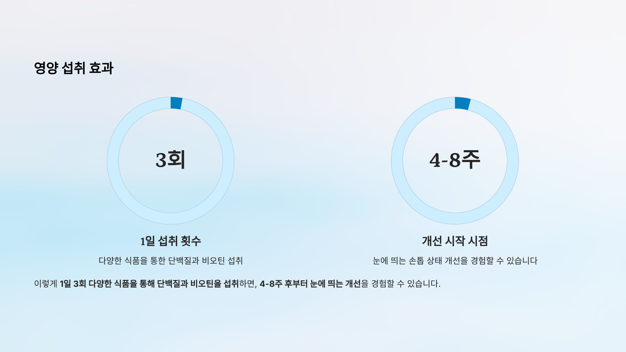 이렇게 1일 3회 다양한 식품을 통해 단백질과 비오틴을 섭취하면, 4-8주 후부터 눈에 띄는 개선을 경험할 수 있다.