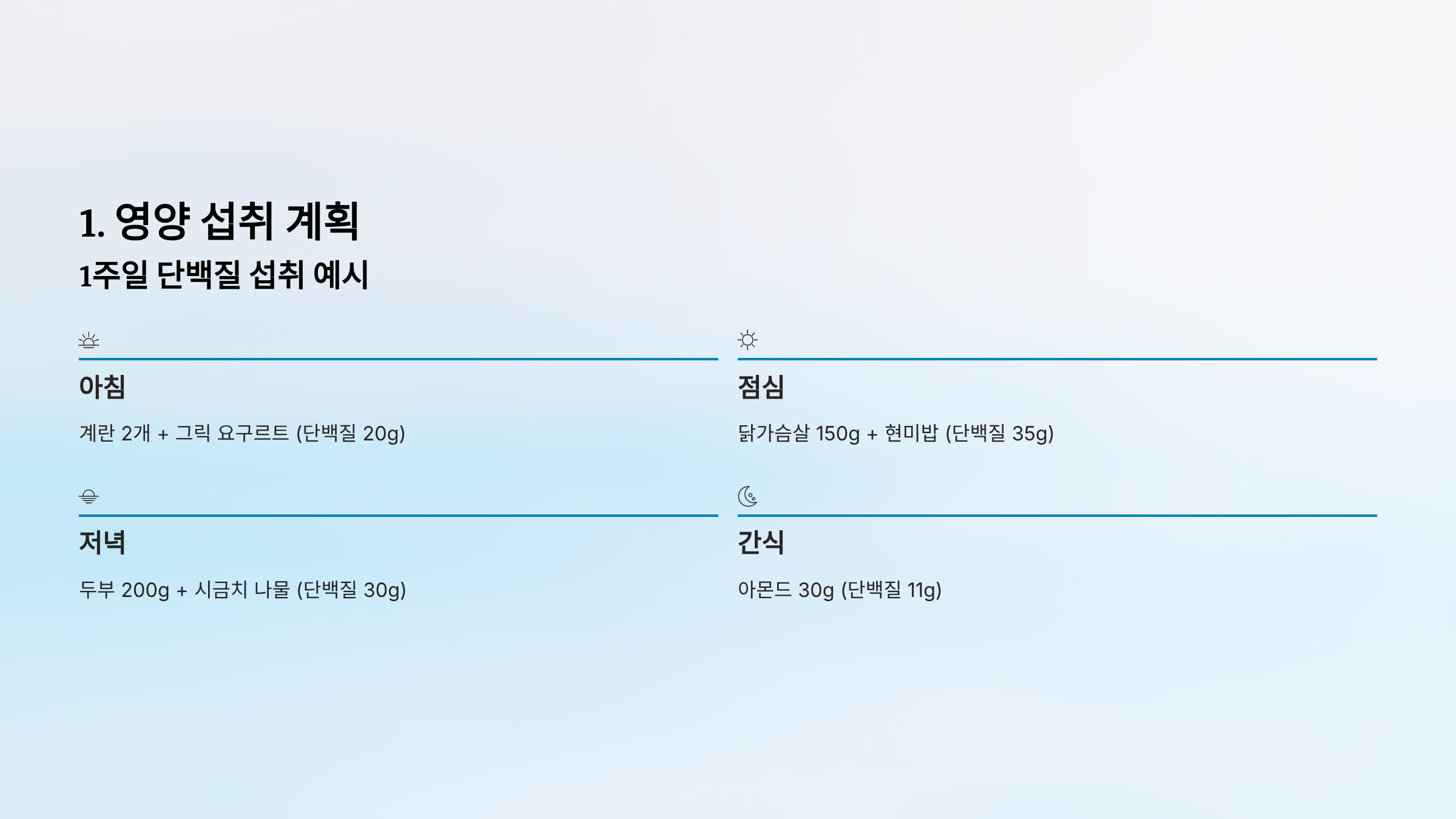 - 아침: 계란 2개 + 그릭 요구르트 (단백질 20g)