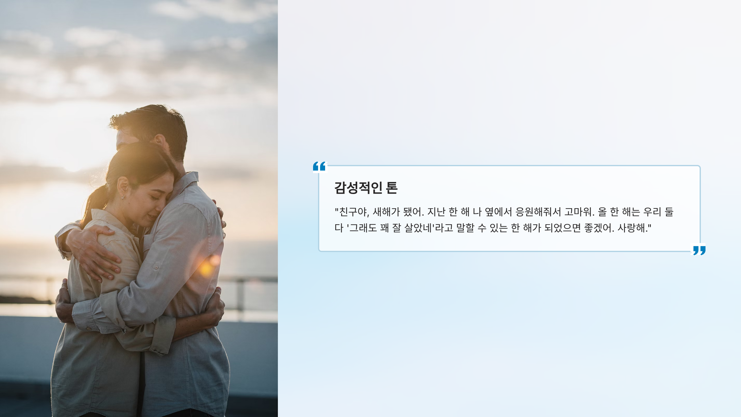 "친구야, 새해가 됐어. 지난 한 해 나 옆에서 응원해줘서 고마워. 올 한 해는 우리 둘 다 '그래도 꽤 잘 살았네'라고 말할 수 있는 한 해가 되었으면 좋겠어. 사랑해."