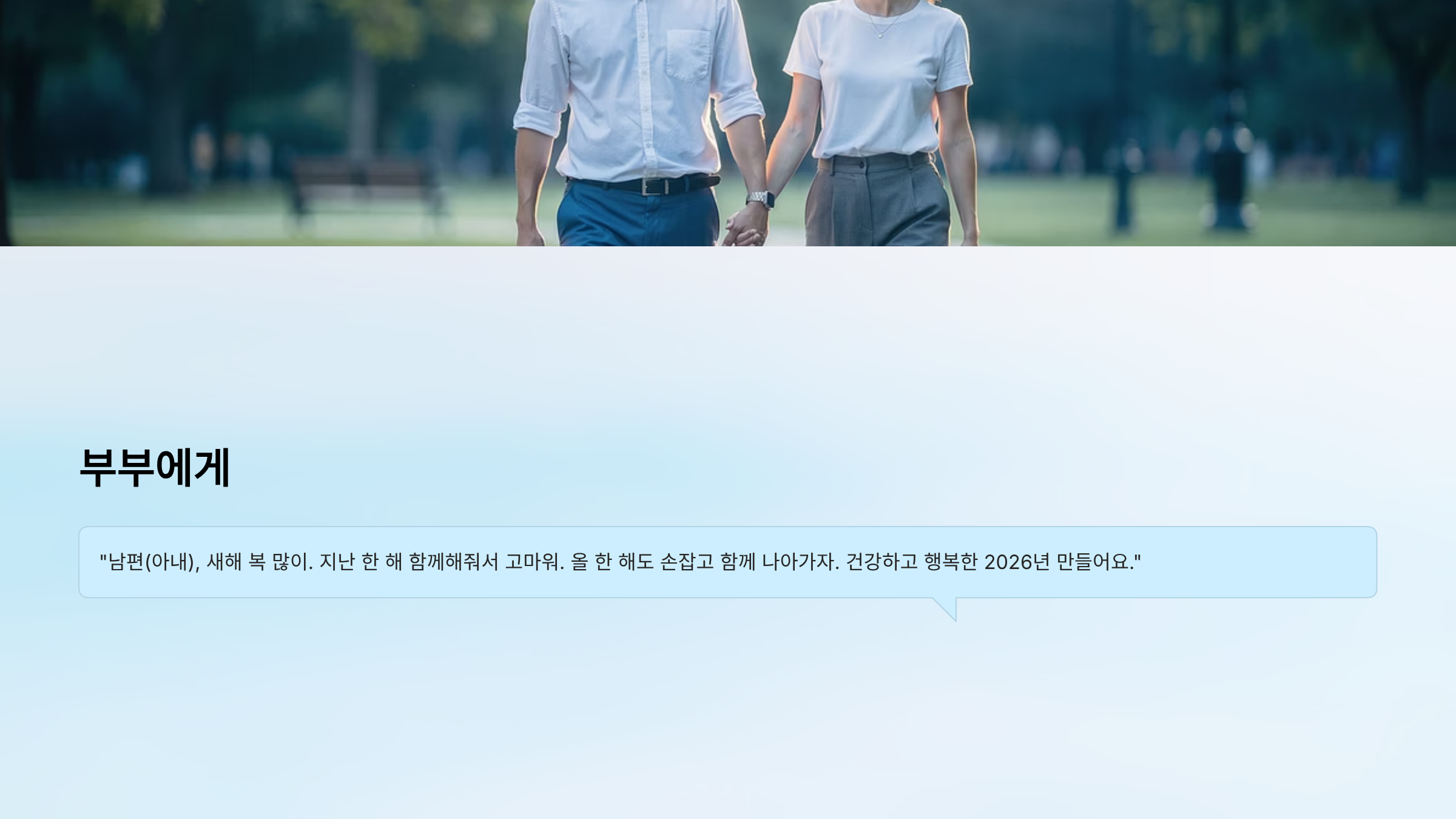 "남편(아내), 새해 복 많이. 지난 한 해 함께해줘서 고마워. 올 한 해도 손잡고 함께 나아가자. 건강하고 행복한 2026년 만들어요."