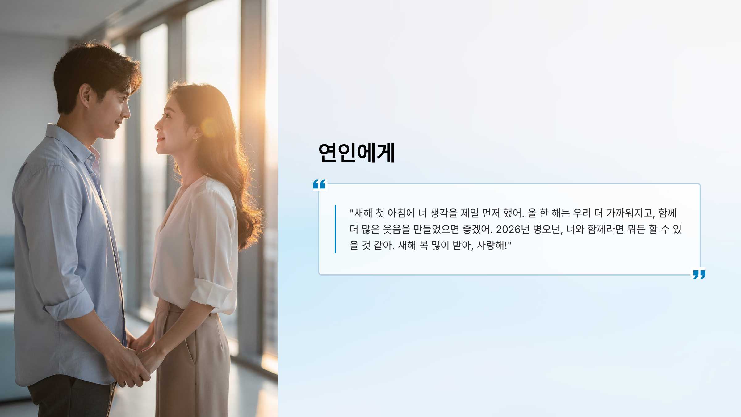 "새해 첫 아침에 너 생각을 제일 먼저 했어. 올 한 해는 우리 더 가까워지고, 함께 더 많은 웃음을 만들었으면 좋겠어. 2026년 병오년, 너와 함께라면 뭐든 할 수 있을 것 같아. 새해 복 많이 받아, 사랑해!"