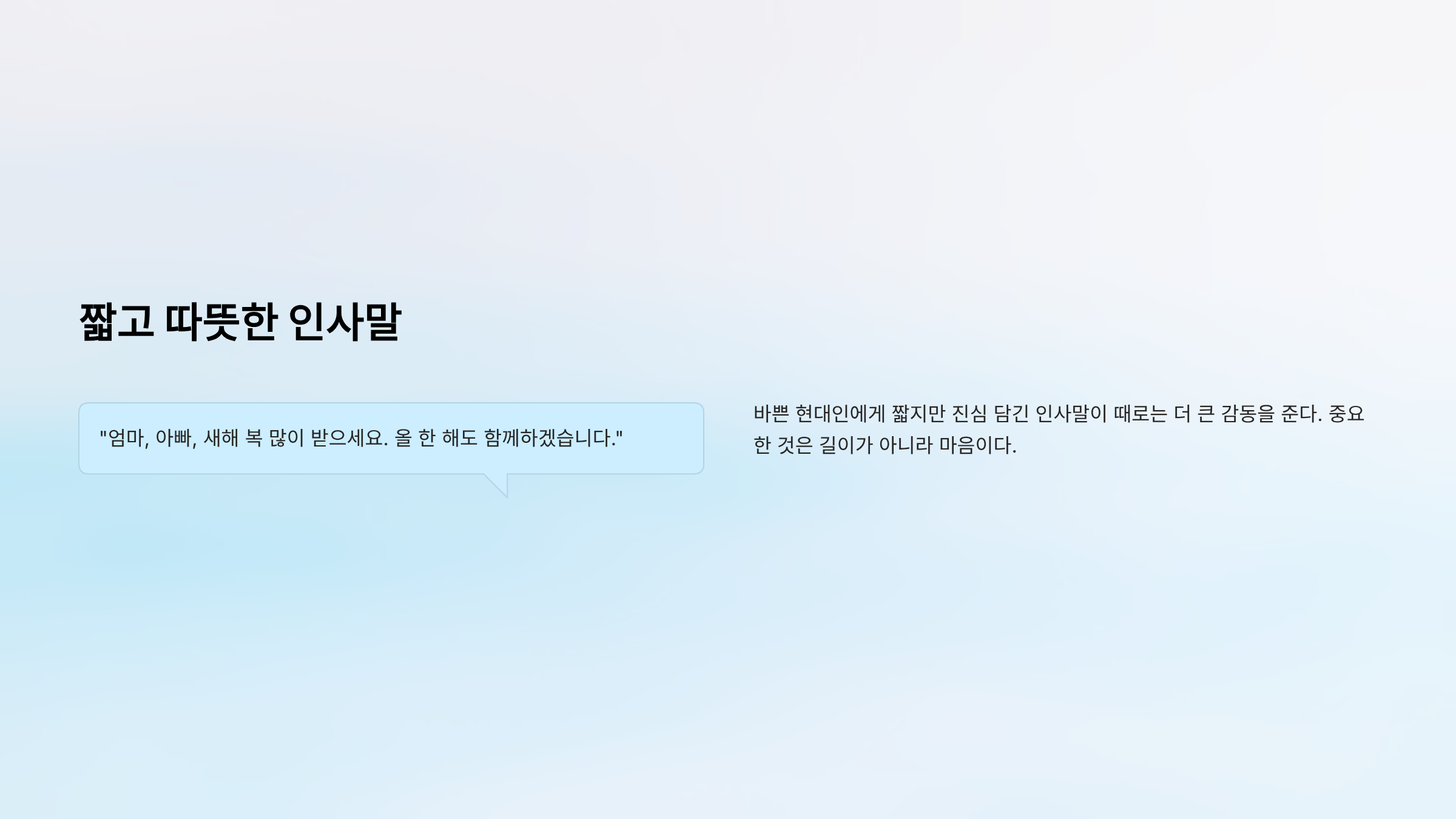 "아버지, 어머니, 새해 복 많이 받으세요. 2026년 병오년에는 건강하시고 무사한 한 해가 되시길 기원합니다. 지난 한 해 저를 위해 베풀어주신 사랑과 헌신에 깊이 감사드립니다. 올 한 해도 효도하는 자식이 되겠습니다."