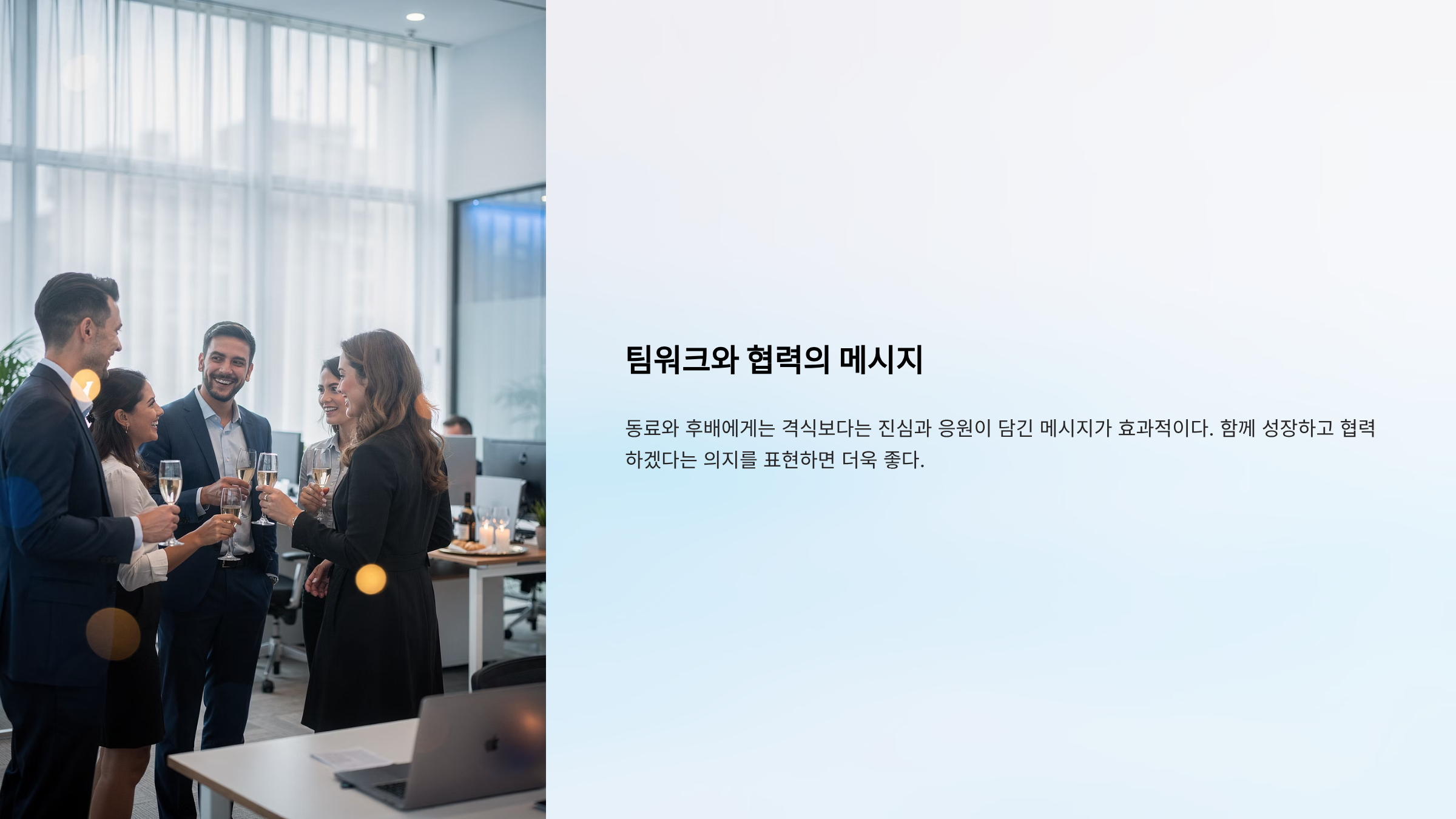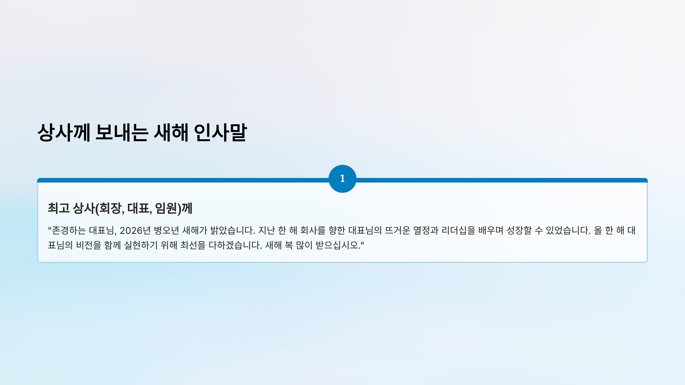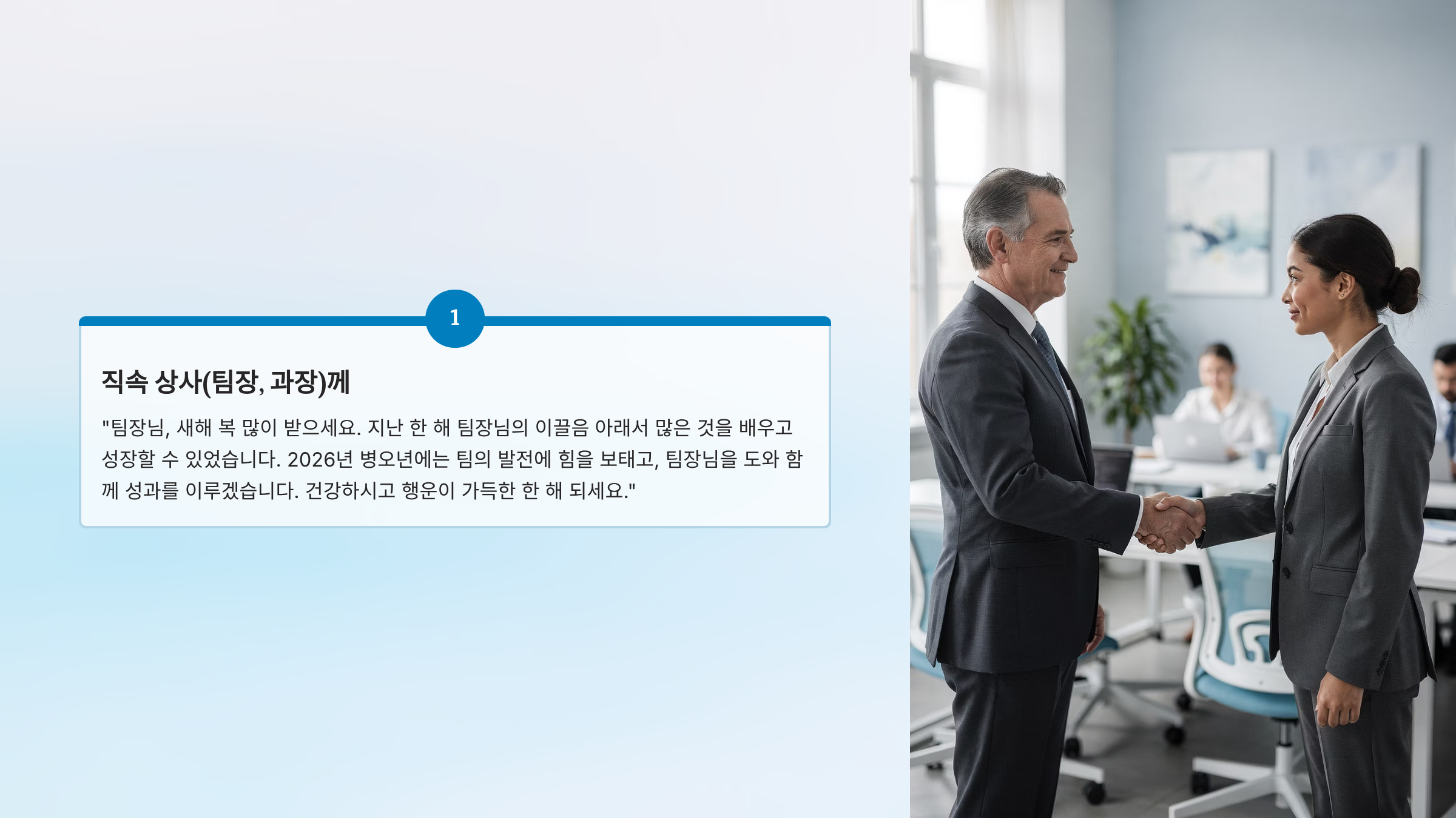 "존경하는 대표님, 2026년 병오년 새해가 밝았습니다. 지난 한 해 회사를 향한 대표님의 뜨거운 열정과 리더십을 배우며 성장할 수 있었습니다. 올 한 해 대표님의 비전을 함께 실현하기 위해 최선을 다하겠습니다. 새해 복 많이 받으십시오."