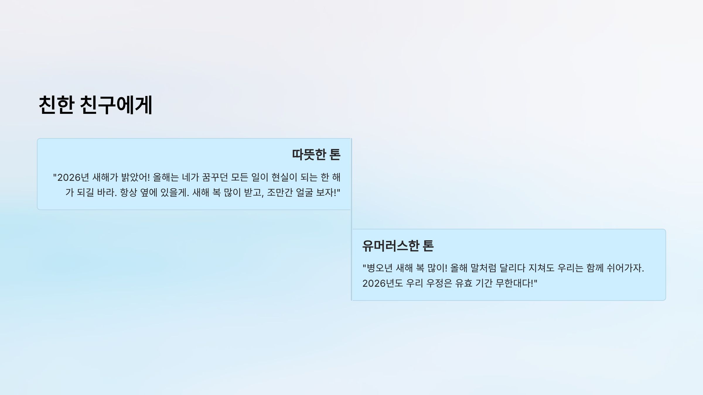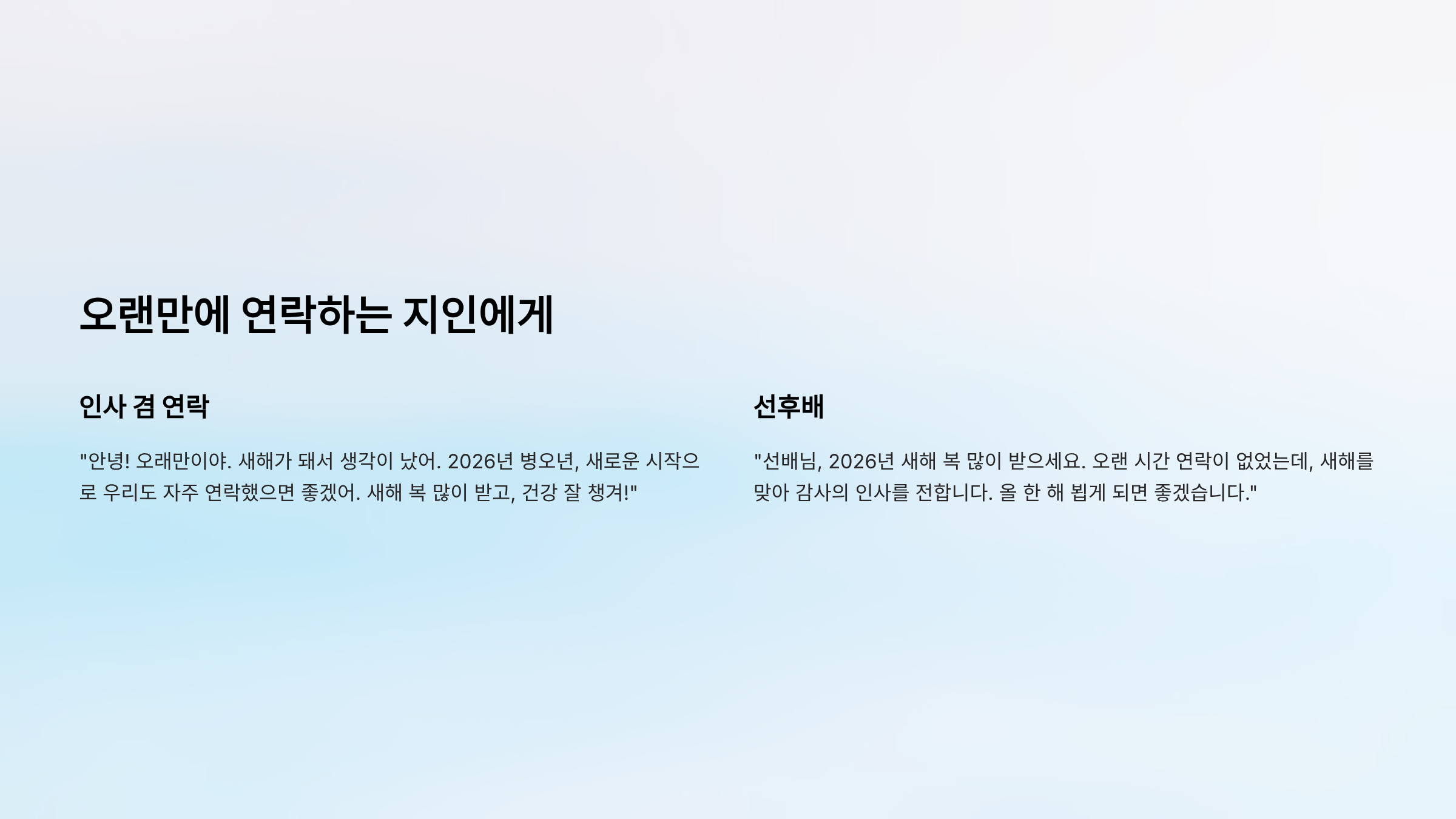 "안녕! 오래만이야. 새해가 돼서 생각이 났어. 2026년 병오년, 새로운 시작으로 우리도 자주 연락했으면 좋겠어. 새해 복 많이 받고, 건강 잘 챙겨!"