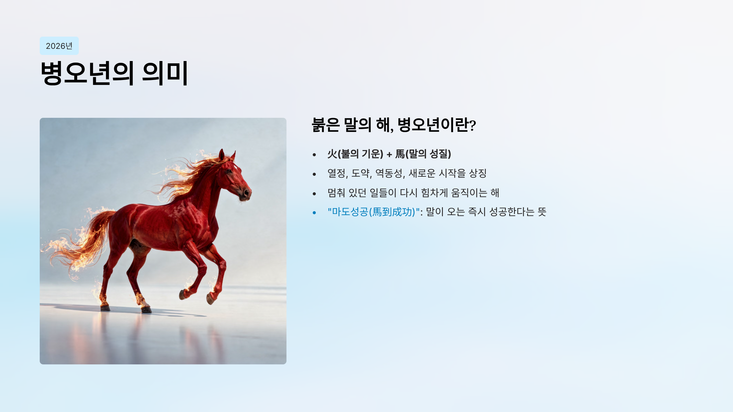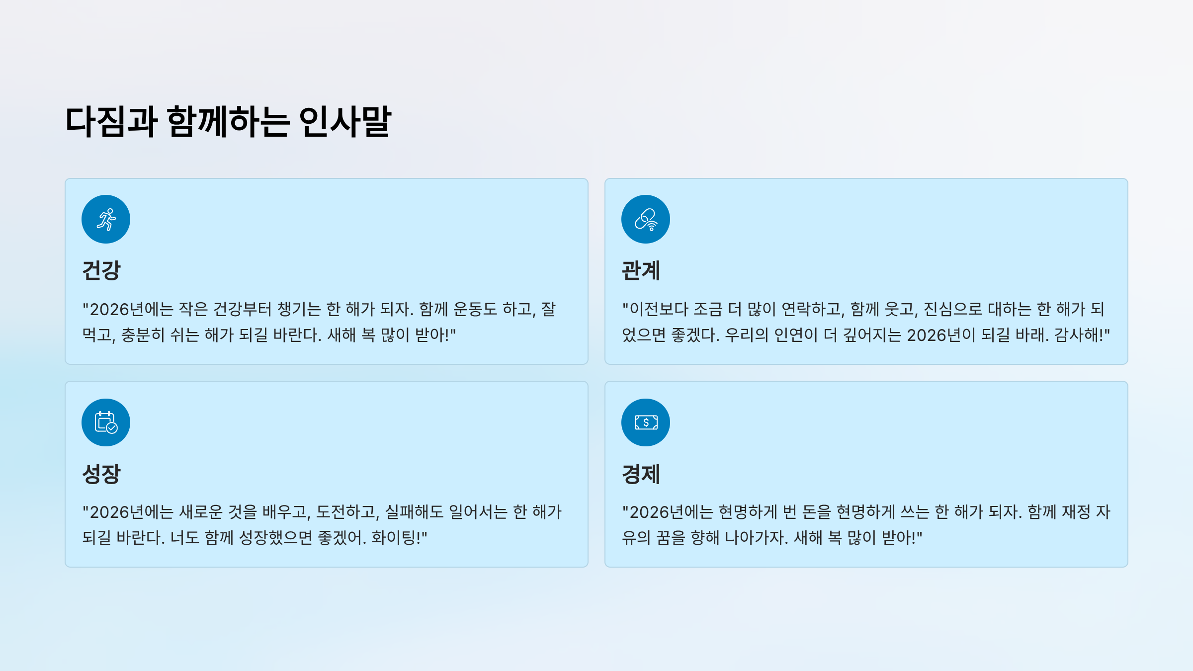 새해 첫날, 휴대폰을 꺼낸 순간 고민이 된다. "뭐라고 인사할까?" 단순히 "새해 복 많이 받으세요"만으로는 뭔가 부족해 보인다. 특히 부모님, 직장 상사, 친한 친구, 연인에게 보낼 때는 더욱 그렇다. 남들이 보내는 뻔한 인사말이 아니라, 마음이 전해지는 따뜻한 말 한 마디가 필요한 순간이다. 2026년은 붉은 말의 해, 병오년(丙午年)이다. 열정과 도약, 새로운 시작을 상징하는 이 해에는 더욱 특별한 인사말이 어울린다. 하지만 시간은 없고, 완벽한 표현을 찾기는 어렵다.