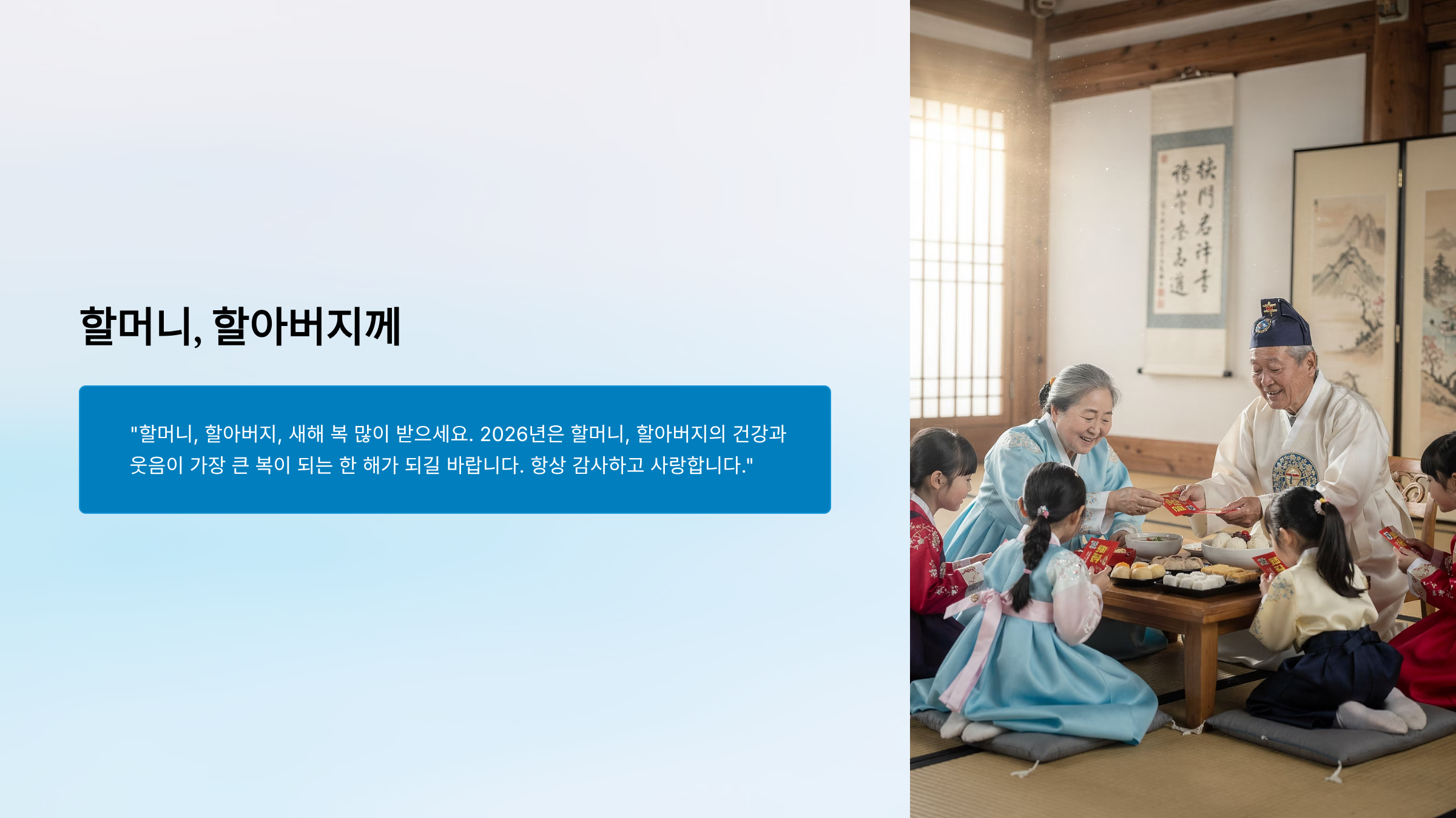 "할머니, 할아버지, 새해 복 많이 받으세요. 2026년은 할머니, 할아버지의 건강과 웃음이 가장 큰 복이 되는 한 해가 되길 바랍니다. 항상 감사하고 사랑합니다."