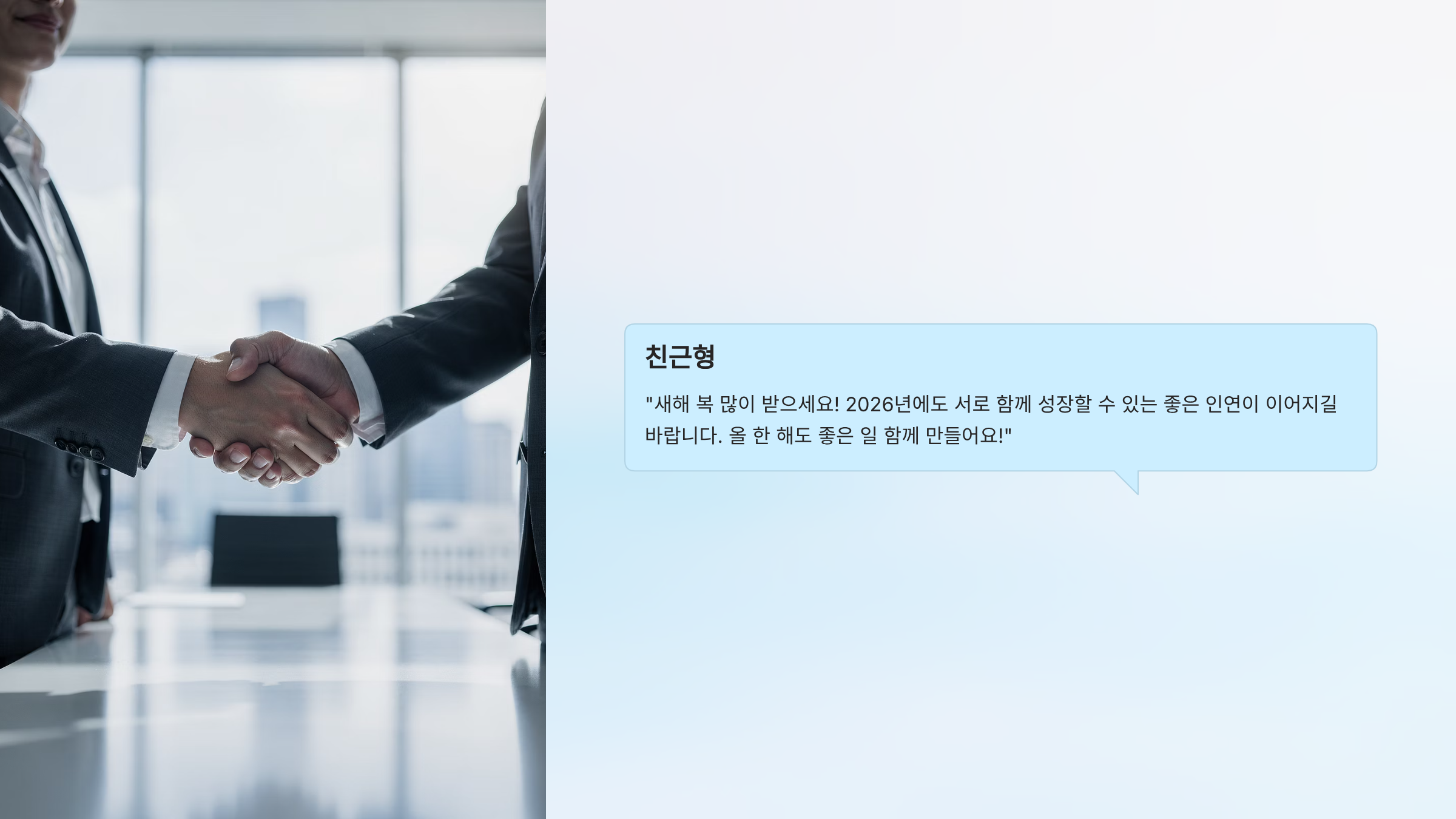 "새해 복 많이 받으세요! 2026년에도 서로 함께 성장할 수 있는 좋은 인연이 이어지길 바랍니다. 올 한 해도 좋은 일 함께 만들어요!"