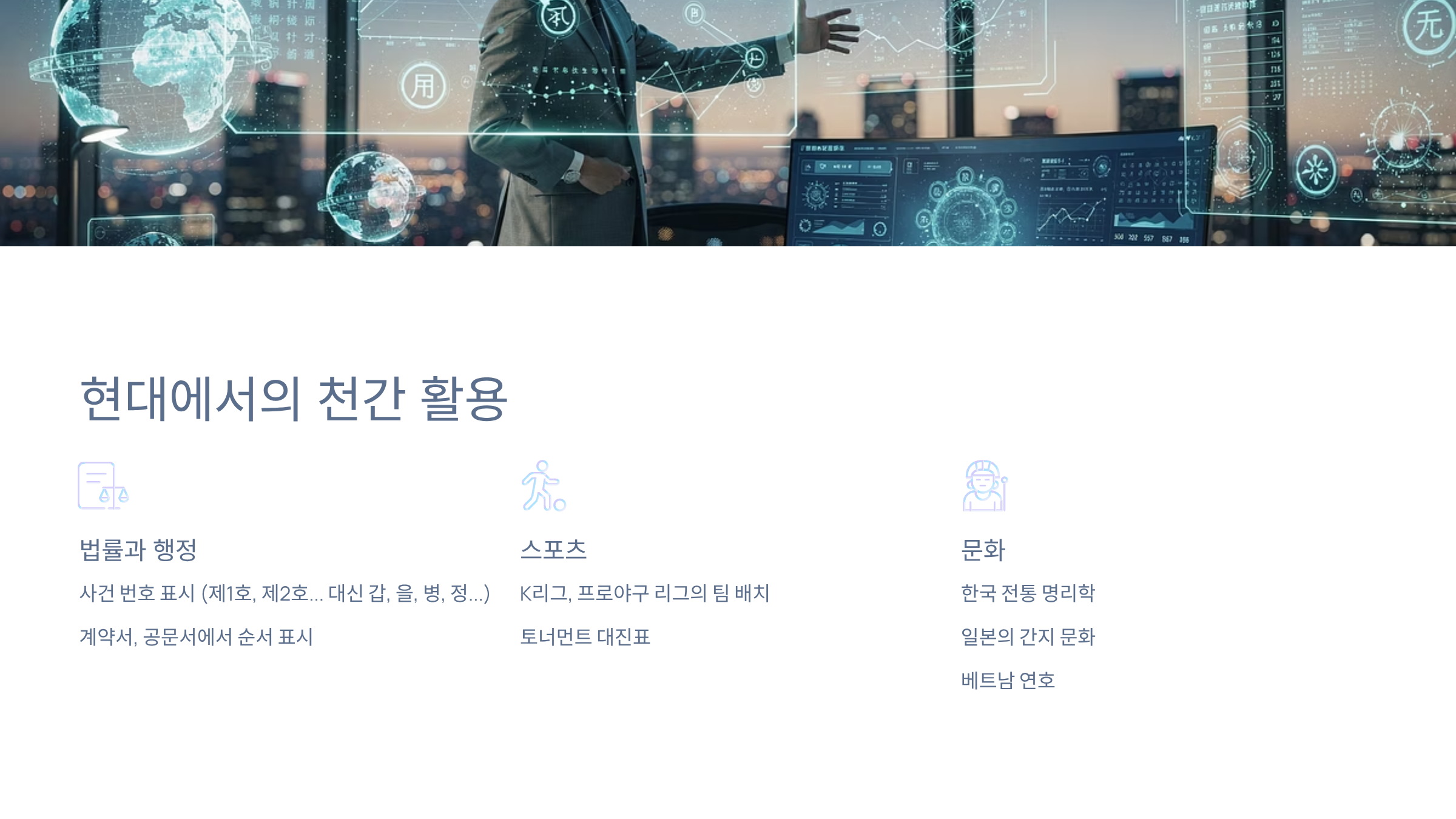 - 현대: 연도, 날짜, 시간 표시, 사주, 운세, 법률 순서 등에 활용