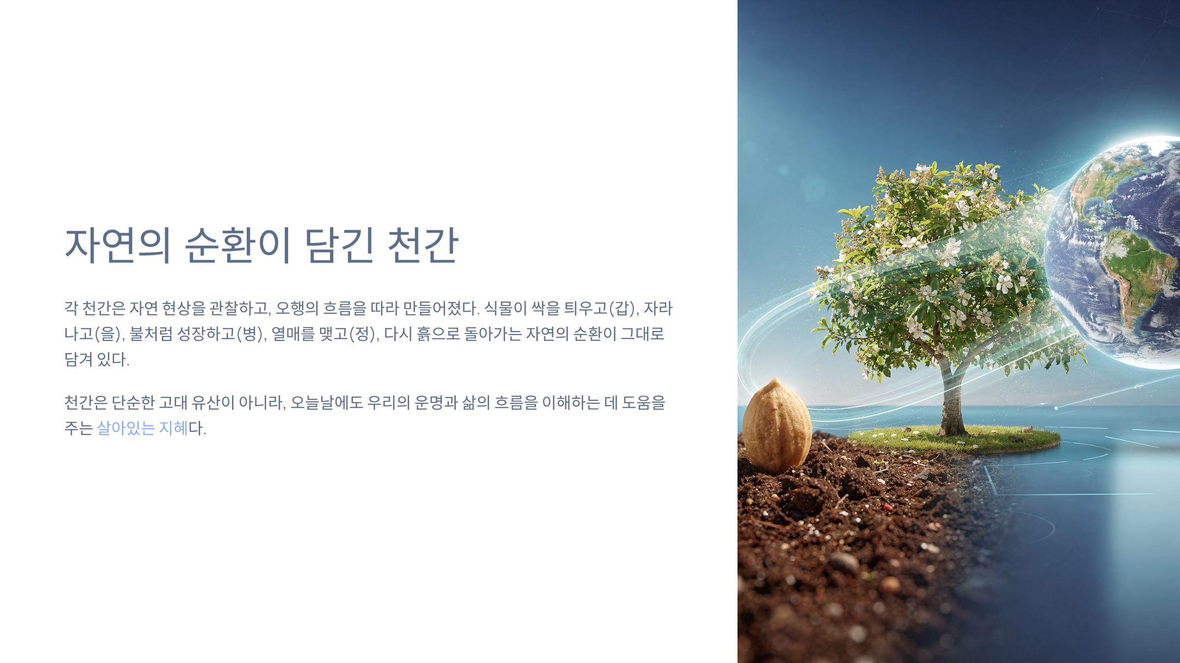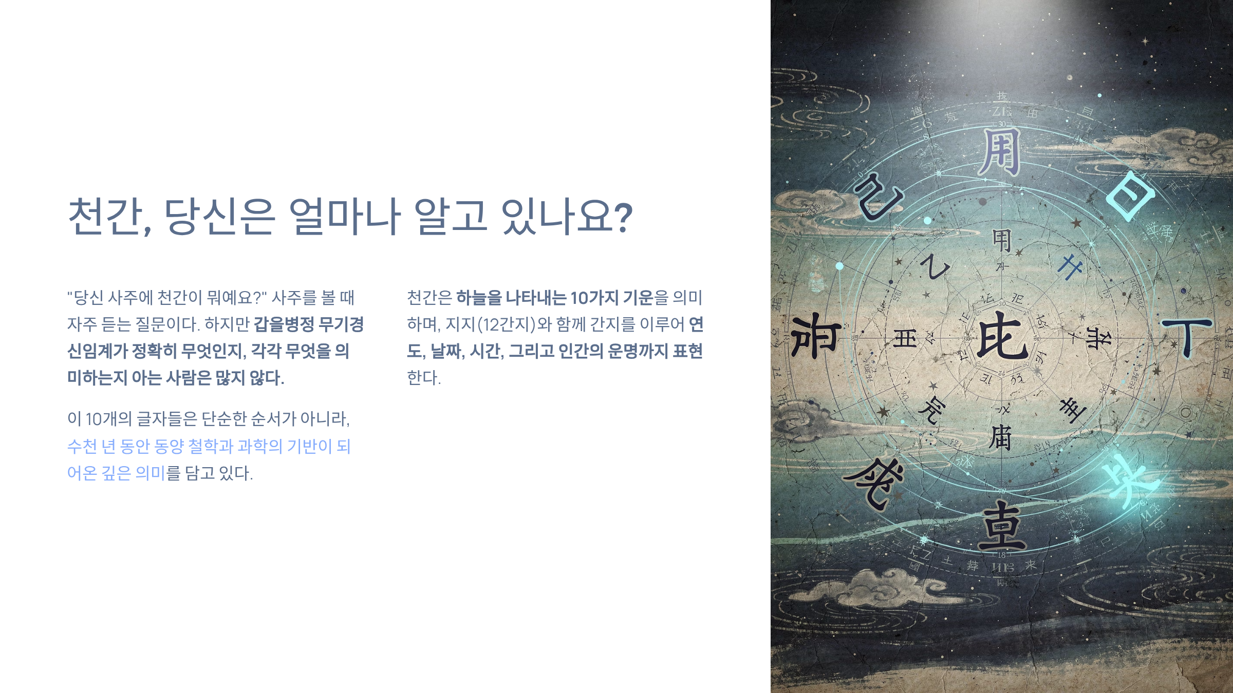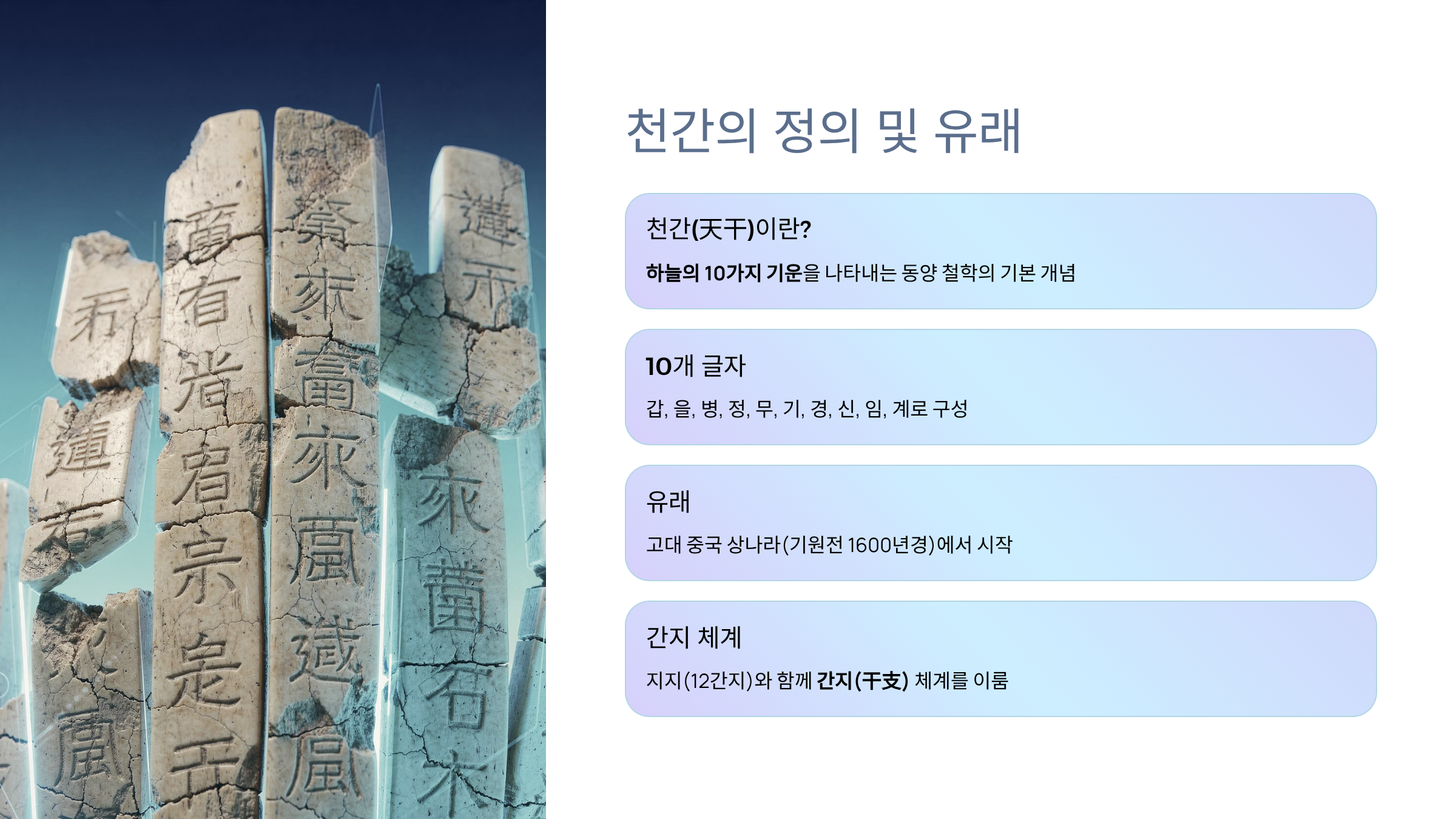 천간은 단순한 고대 유산이 아니라, 오늘날에도 우리의 운명과 삶의 흐름을 이해하는 데 도움을 주는 살아있는 지혜다.