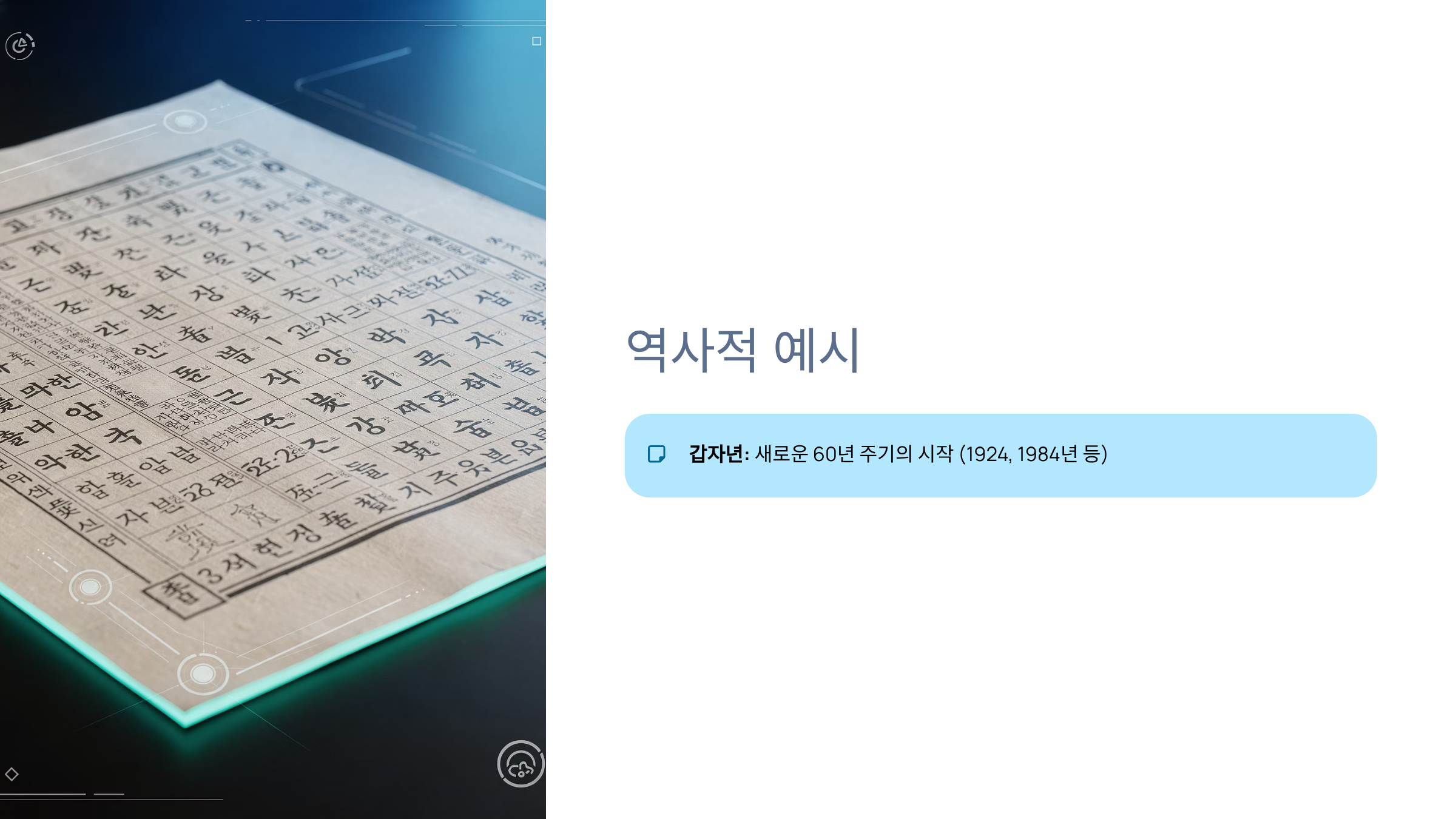 - 갑자년(甲子年): 천간 '갑' + 지지 '자' = 1번째 간지