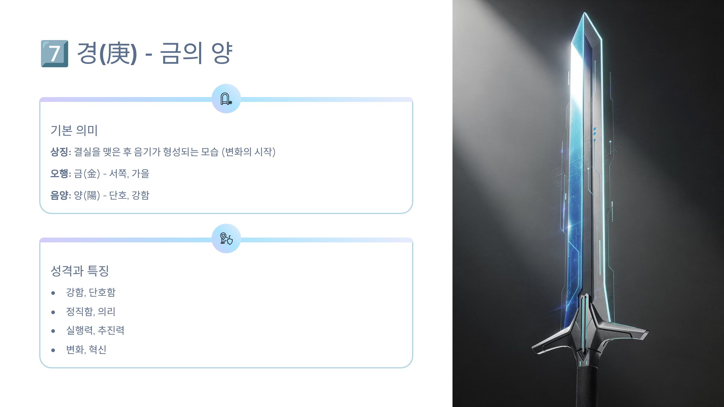 | 7 | 경 | 庚 | 양 | 금 | 경 | 경계, 단단함, 변화 |