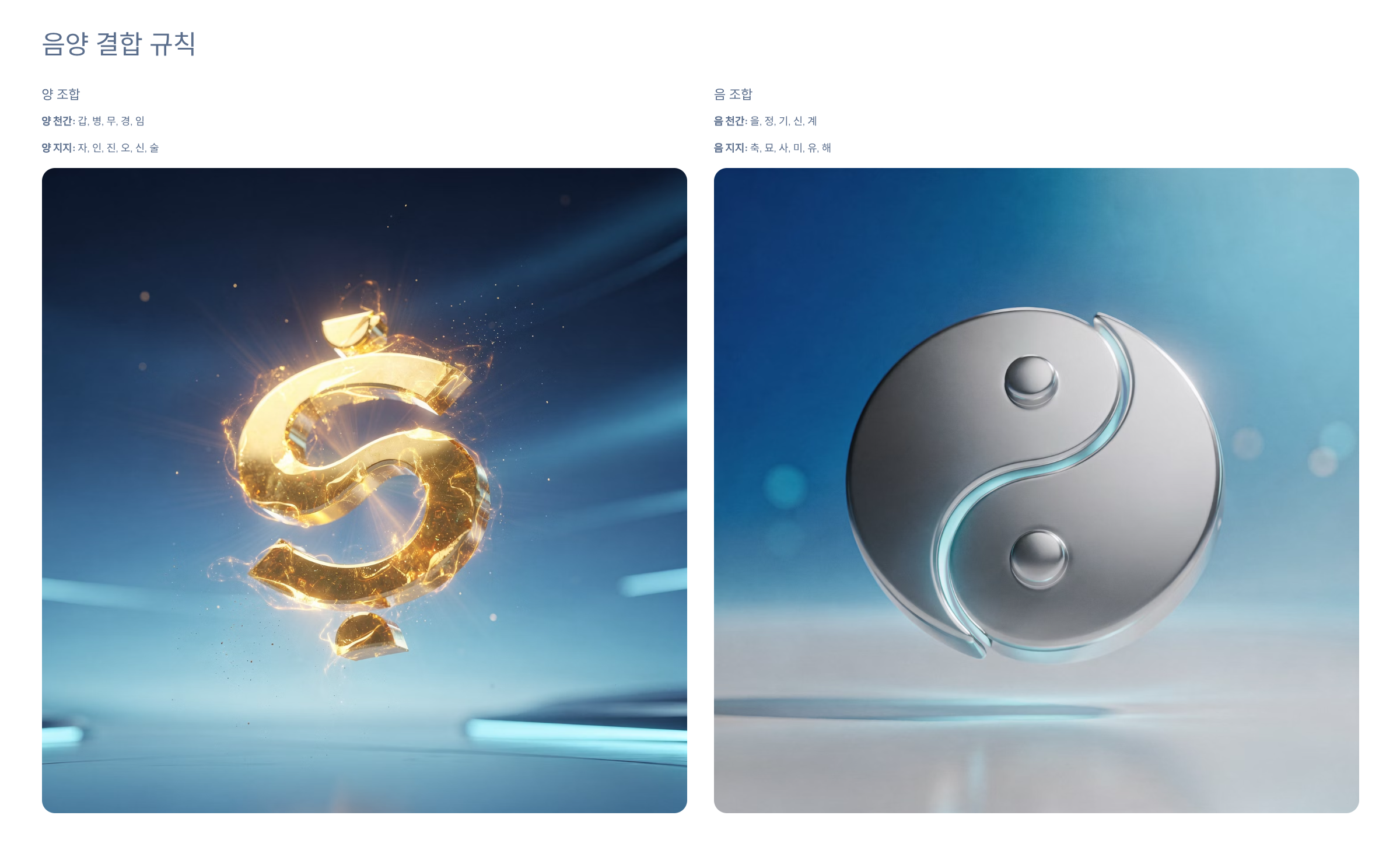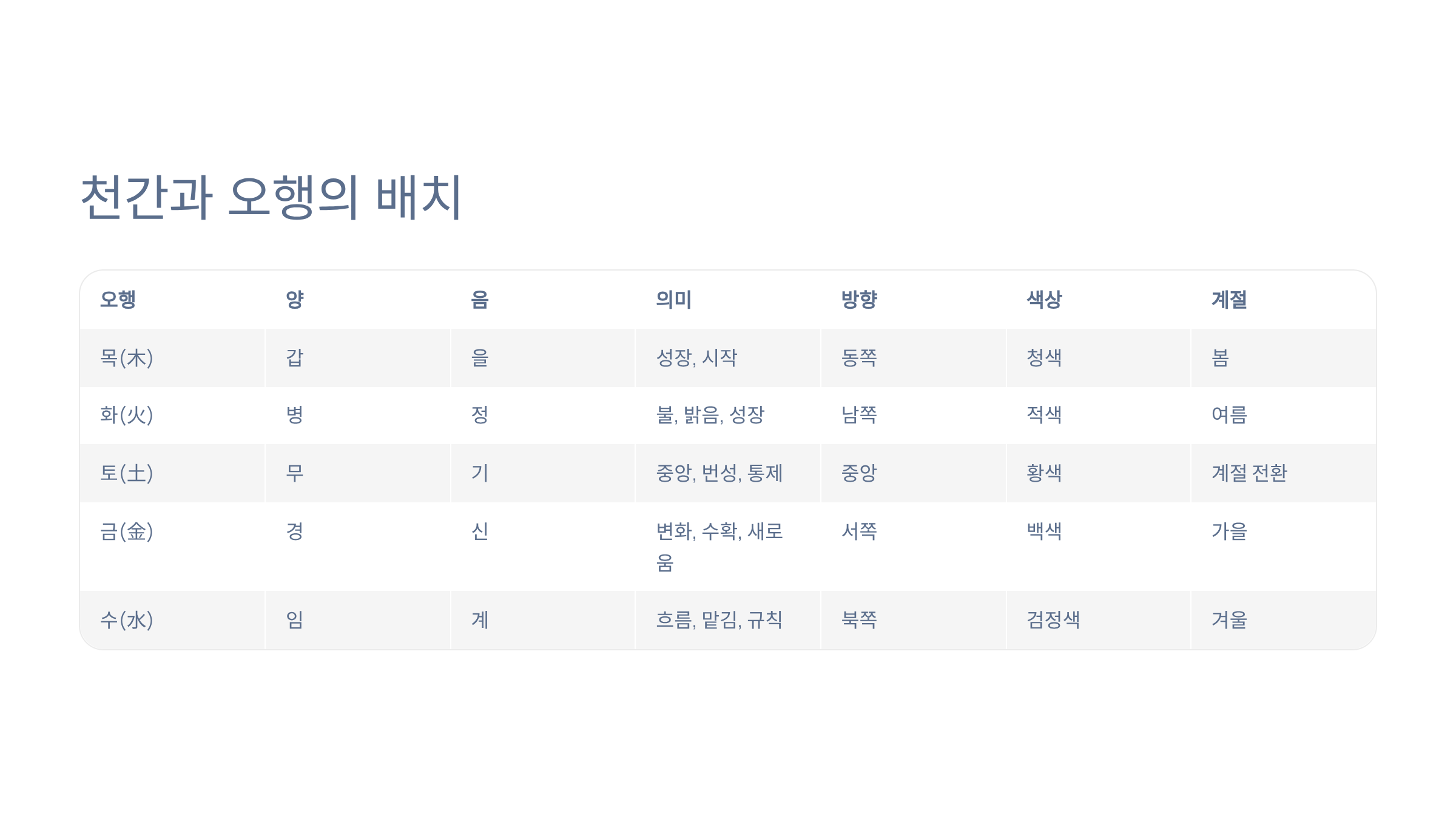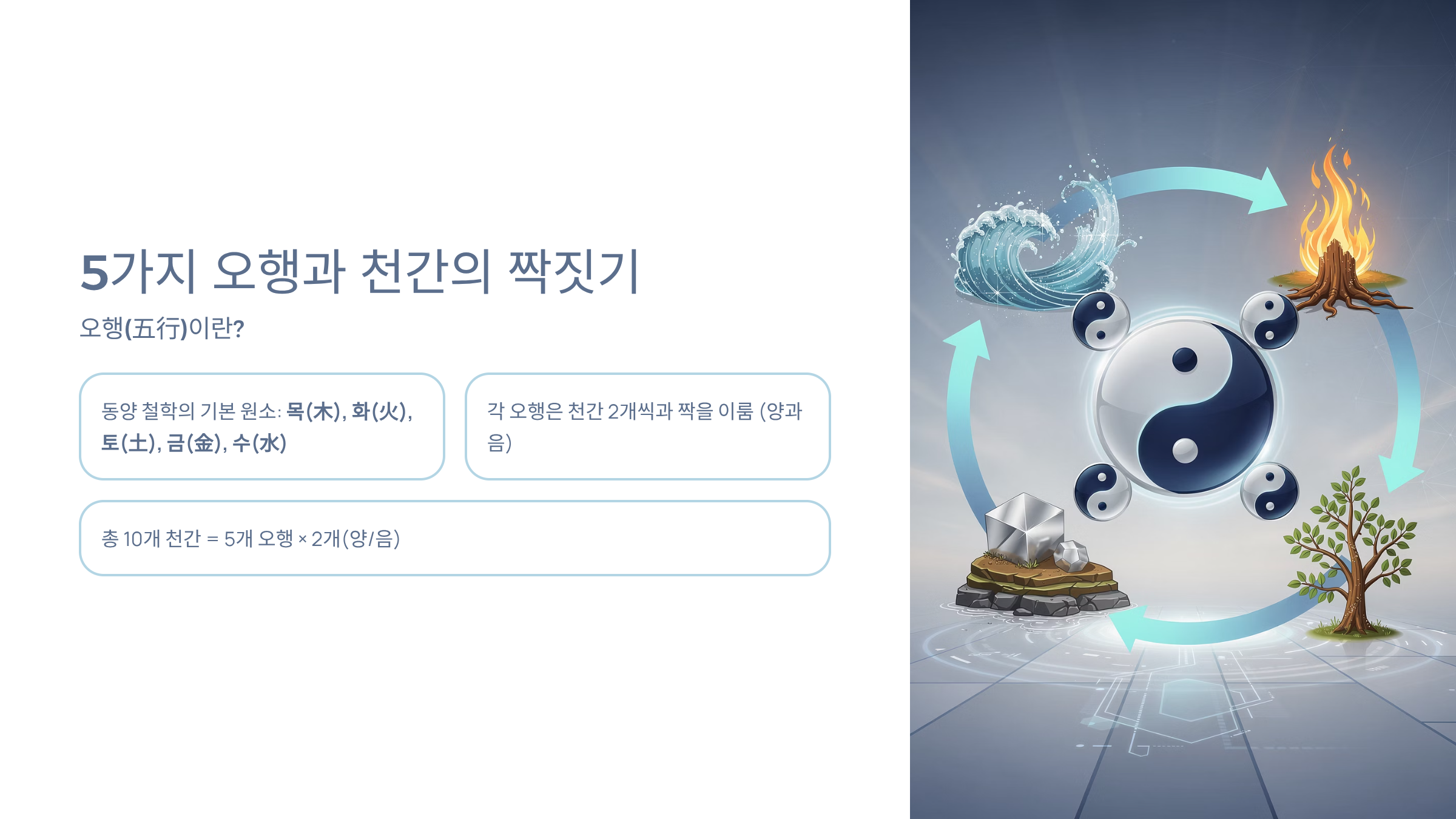 - 총 10개 천간 = 5개 오행 × 2개(양/음)