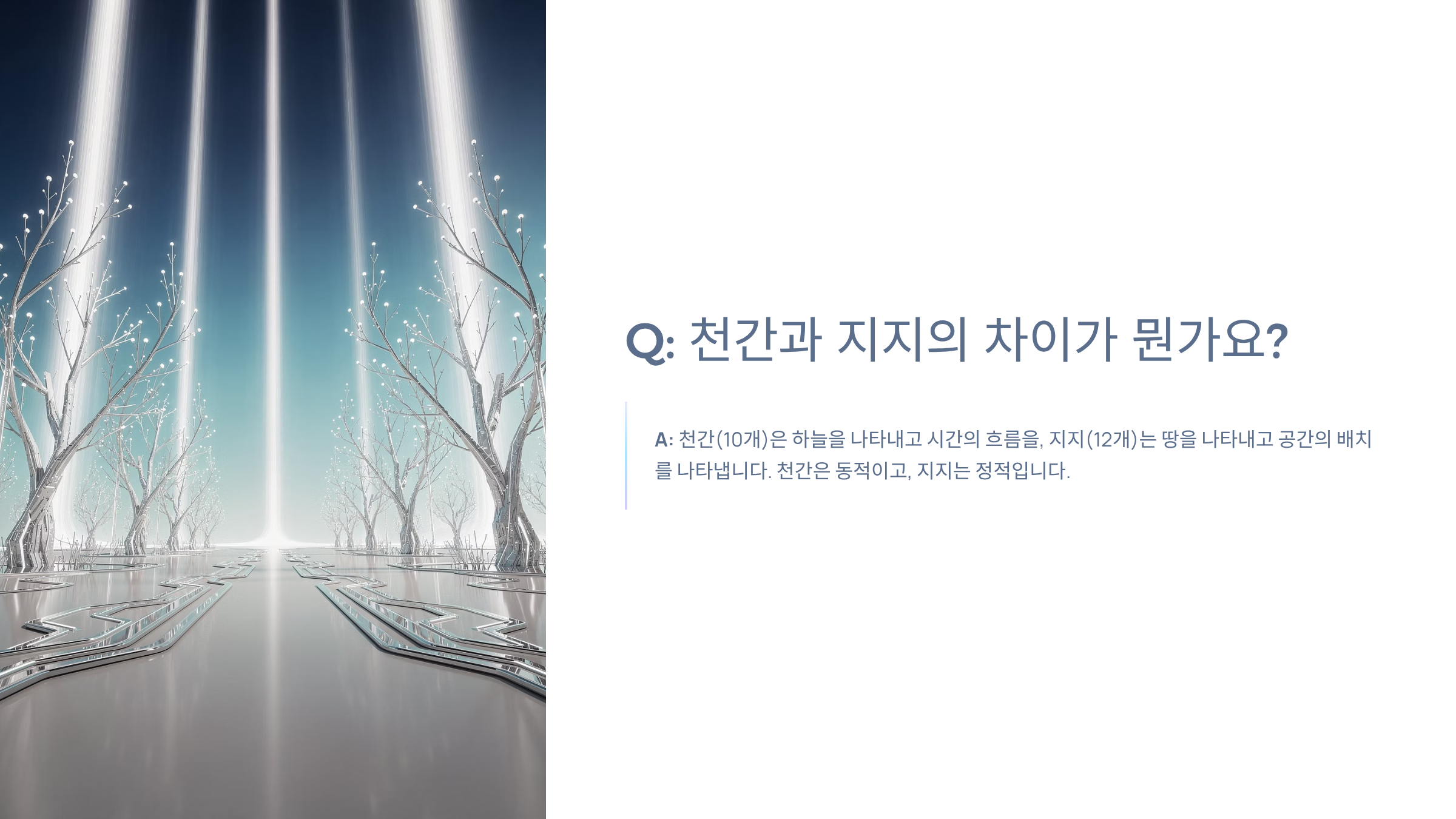 A: 천간(10개)은 하늘을 나타내고 시간의 흐름을, 지지(12개)는 땅을 나타내고 공간의 배치를 나타냅니다. 천간은 동적이고, 지지는 정적입니다.