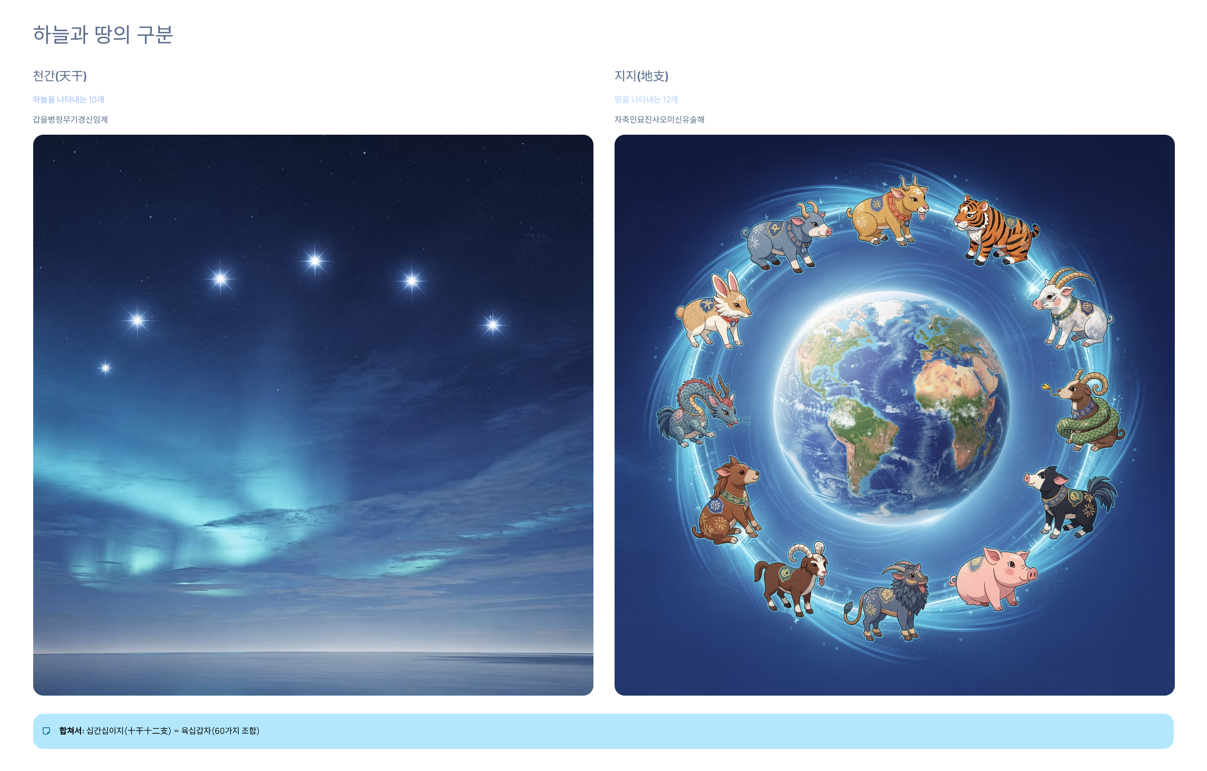 - 합쳐서: 십간십이지(十干十二支) = 육십갑자(60가지 조합)