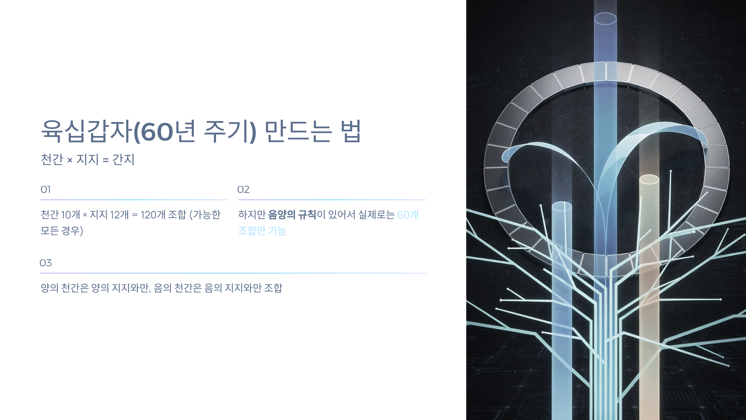 - 천간 10개 × 지지 12개 = 120개 조합 (가능한 모든 경우)