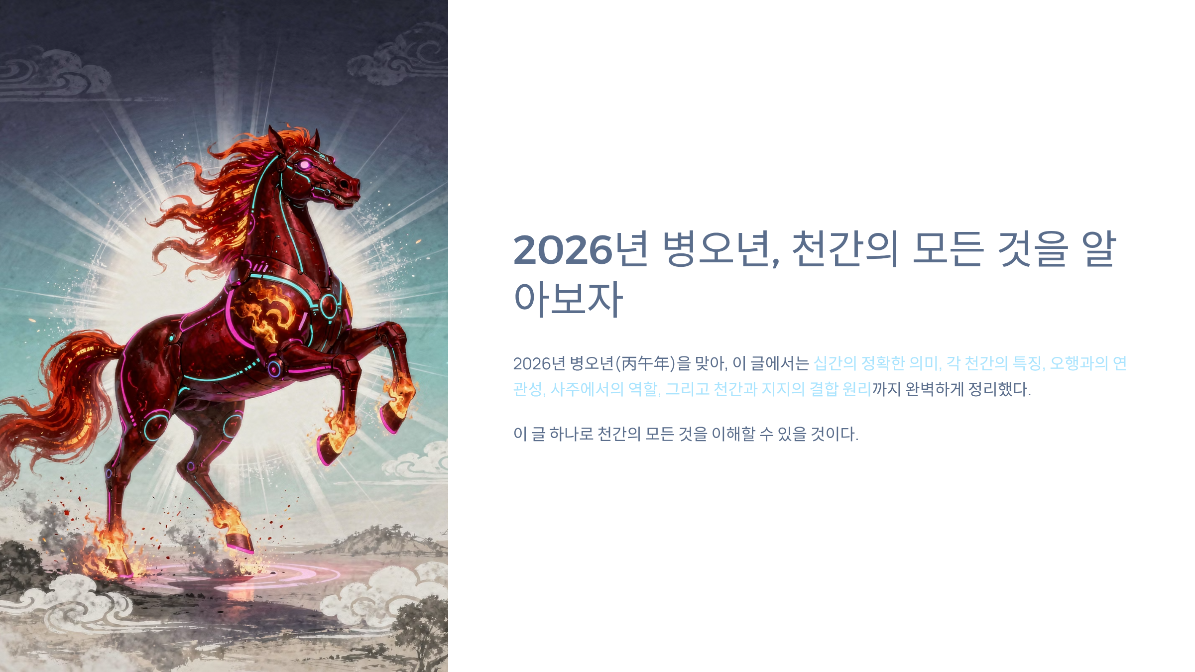 2026년 병오년(丙午年)을 맞아, 이 글에서는 십간의 정확한 의미, 각 천간의 특징, 오행과의 연관성, 사주에서의 역할, 그리고 천간과 지지의 결합 원리까지 완벽하게 정리했다. 이 글 하나로 천간의 모든 것을 이해할 수 있을 것이다.