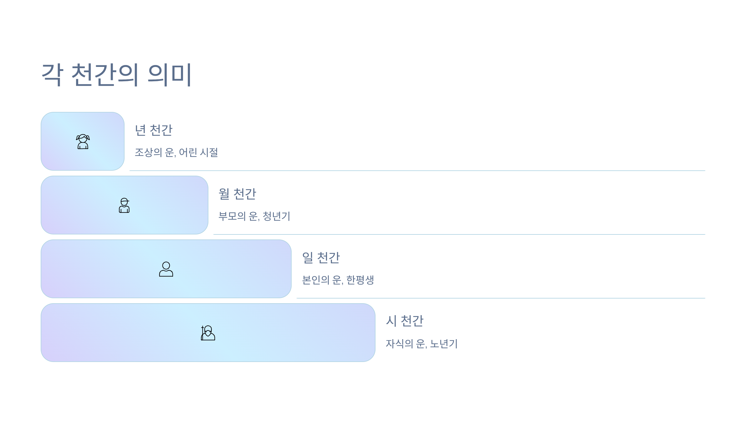 A: 동양 철학과 사주학에서는 천간이 인생의 흐름과 운명에 영향을 미친다고 봅니다. 과학적 증거는 없으나 문화적·철학적 의미는 매우 깊습니다.