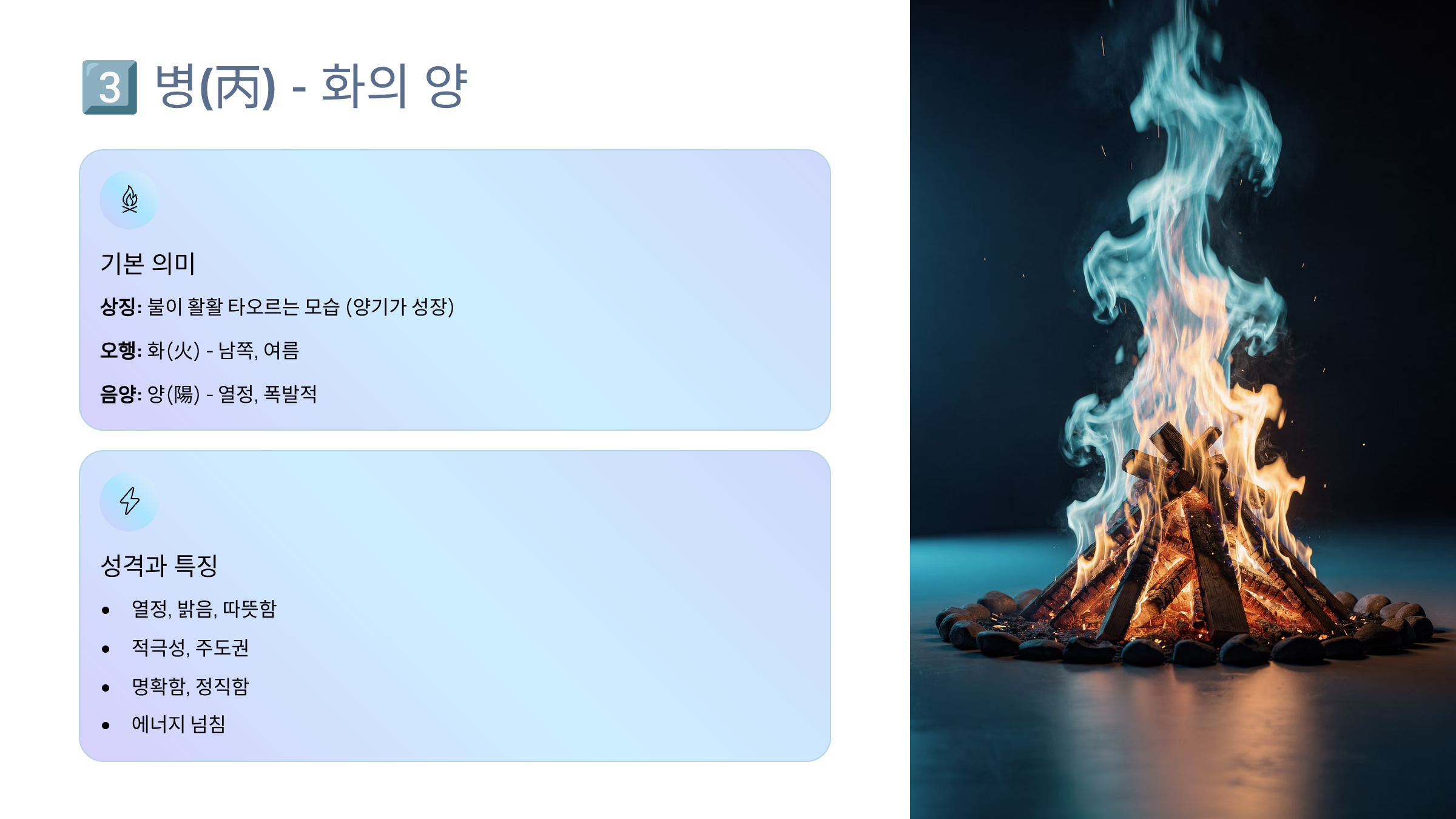 | 3 | 병 | 丙 | 양 | 화 | 병 | 불, 밝음, 성장 |