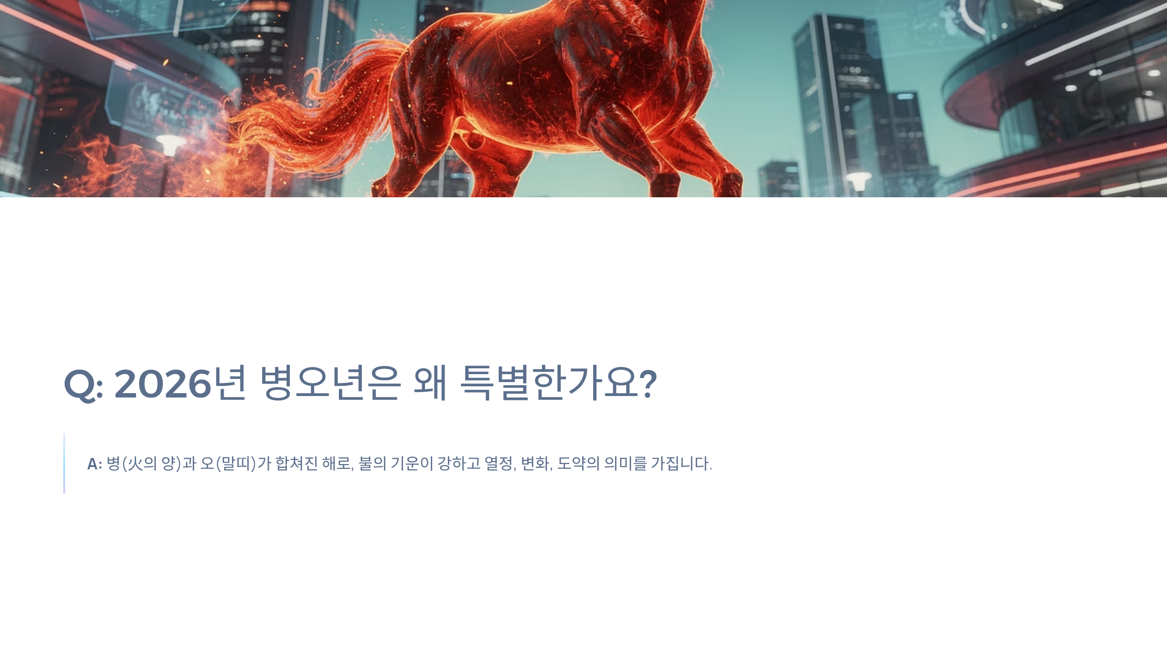 A: 병(火의 양)과 오(말띠)가 합쳐진 해로, 불의 기운이 강하고 열정, 변화, 도약의 의미를 가집니다.
