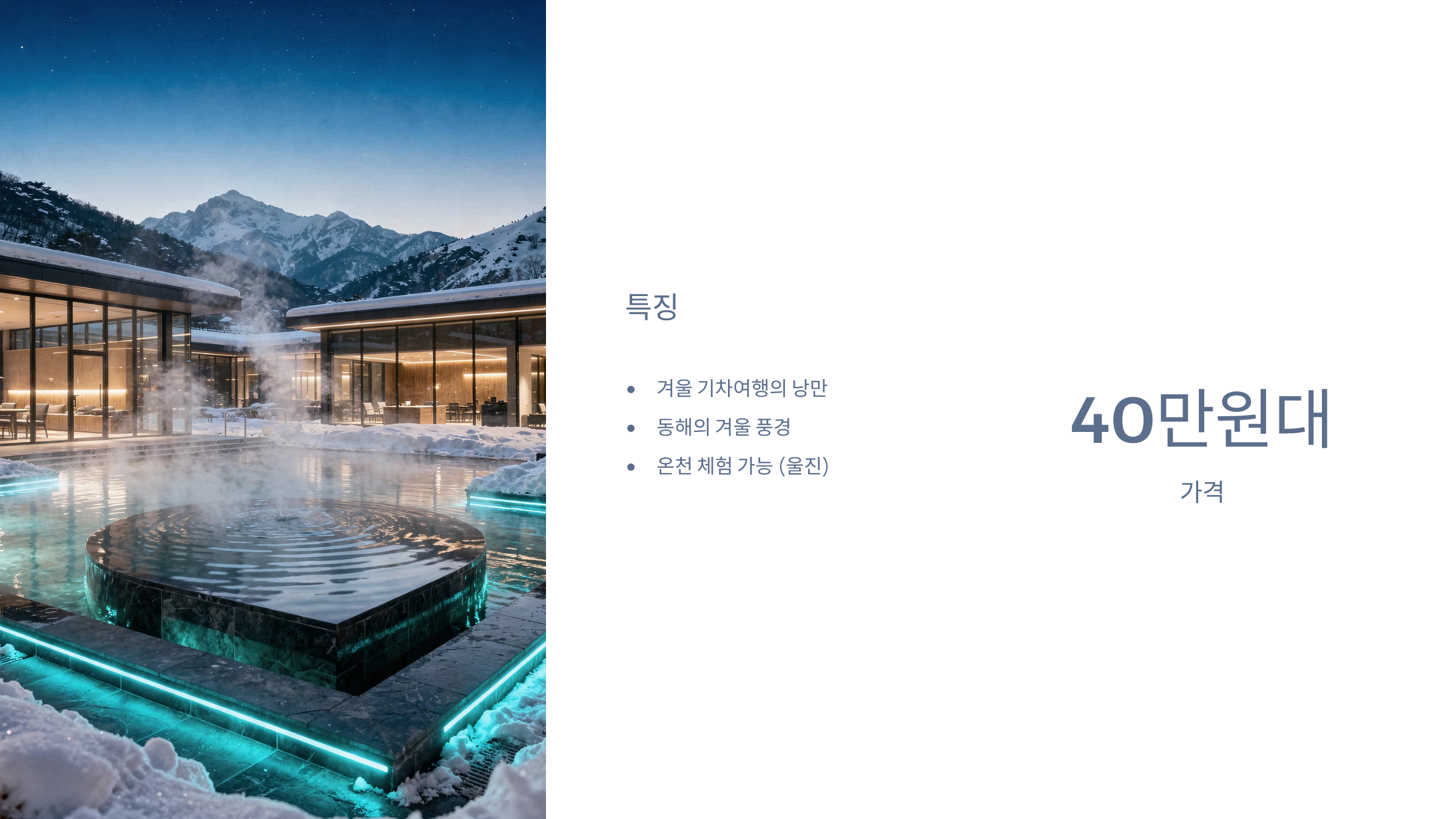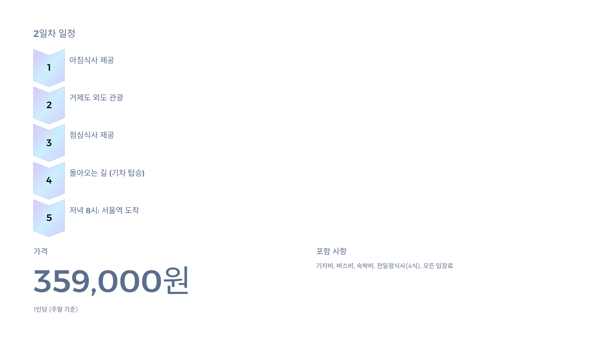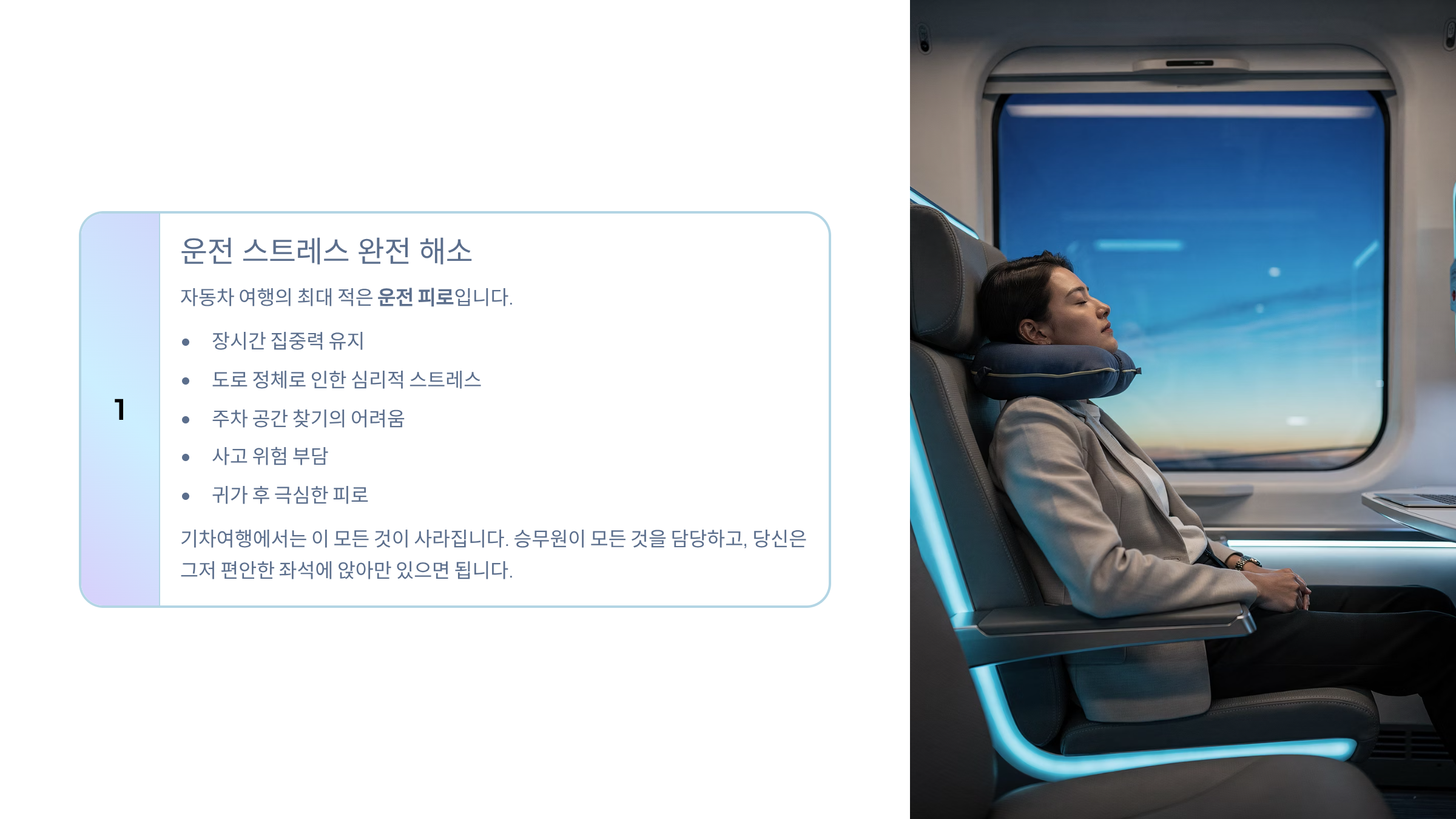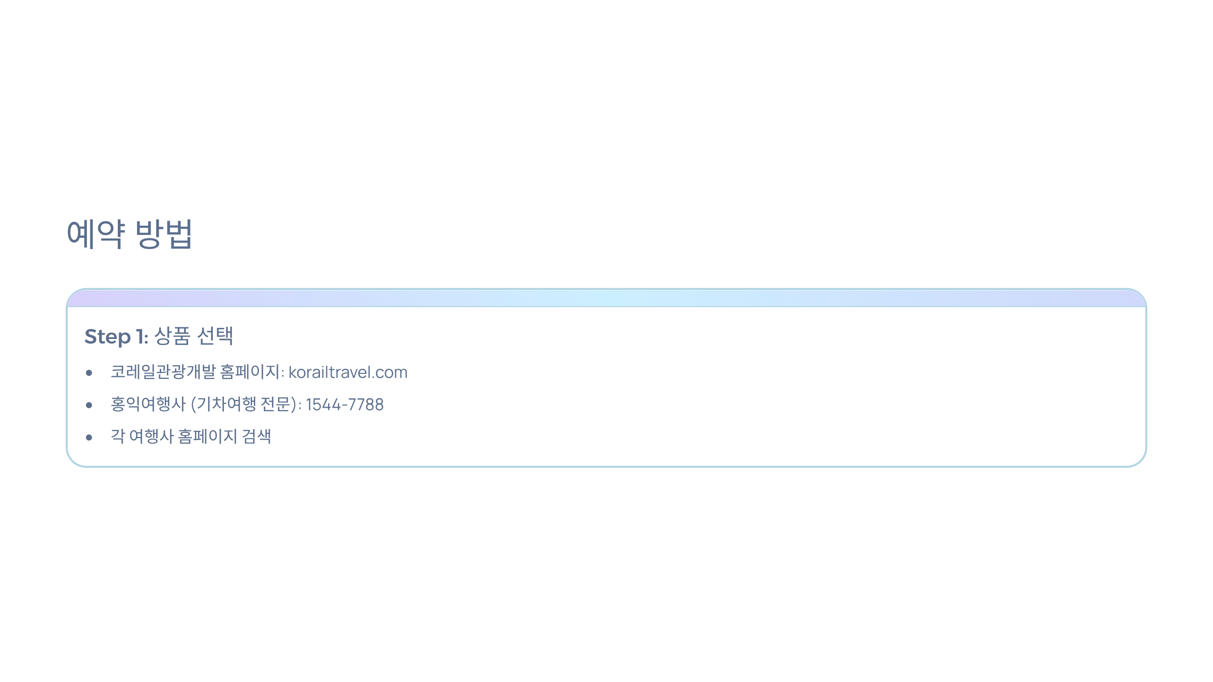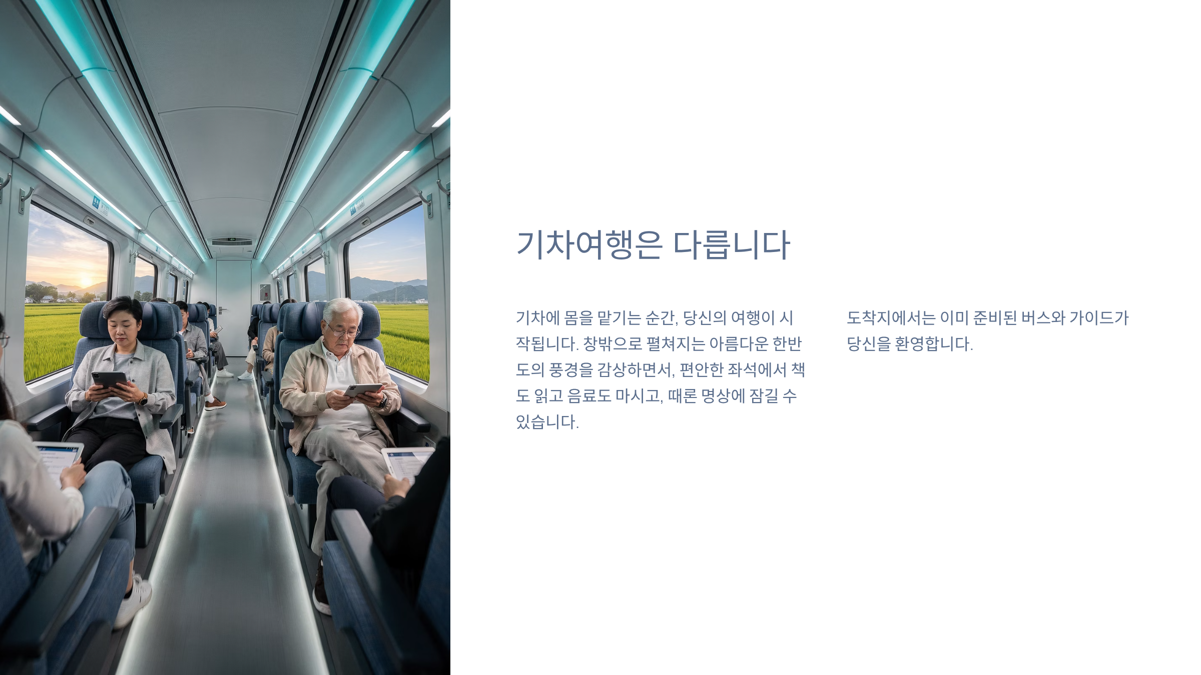 기차에 몸을 맡기는 순간, 당신의 여행이 시작됩니다. 창밖으로 펼쳐지는 아름다운 한반도의 풍경을 감상하면서, 편안한 좌석에서 책도 읽고 음료도 마시고, 때론 명상에 잠길 수 있습니다. 도착지에서는 이미 준비된 버스와 가이드가 당신을 환영합니다.