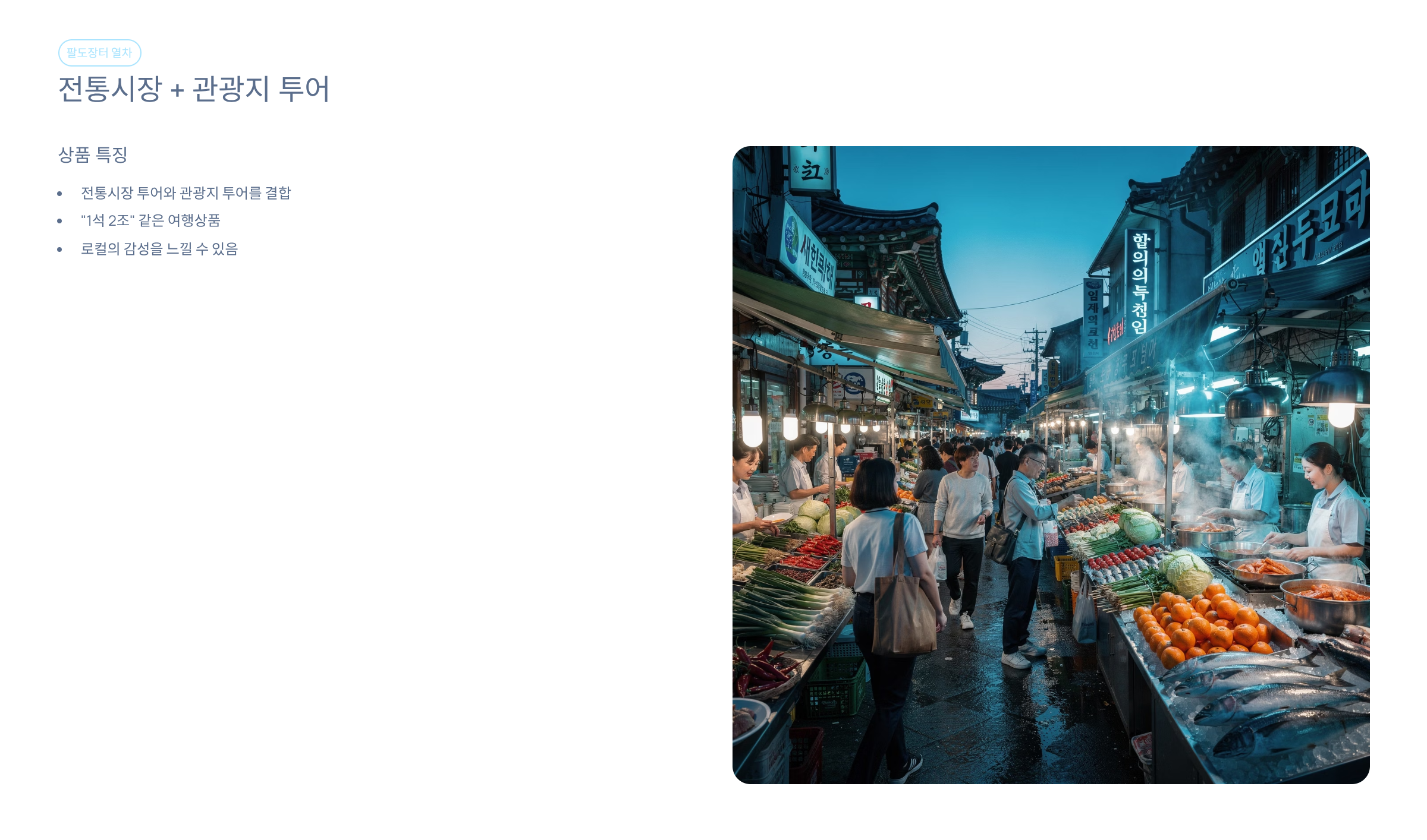 | 팔도장터 | 약 30만원 | 전통시장 투어 포함 | 로컬 감성 선호 |