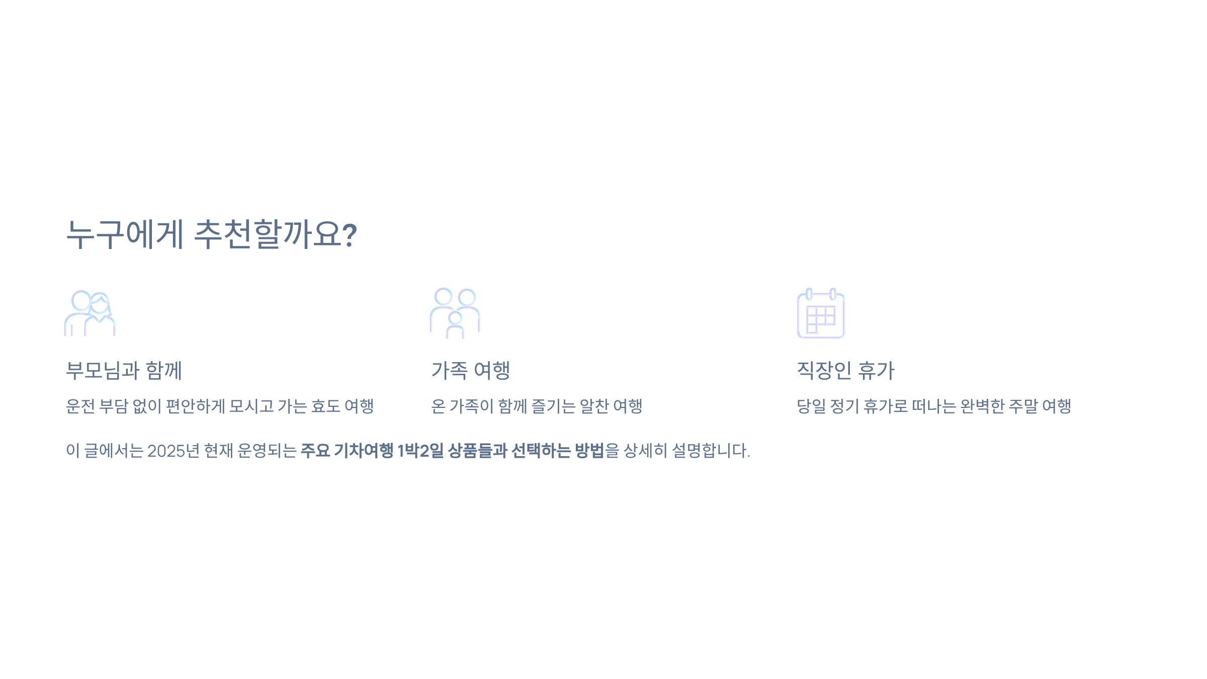 특히 부모님을 모시고 가는 여행, 가족 여행, 당일 정기 휴가가 있는 직장인들에게 기차여행 1박2일 상품은 최고의 선택입니다. 이 글에서는 2025년 현재 운영되는 주요 기차여행 1박2일 상품들과 선택하는 방법을 상세히 설명합니다.