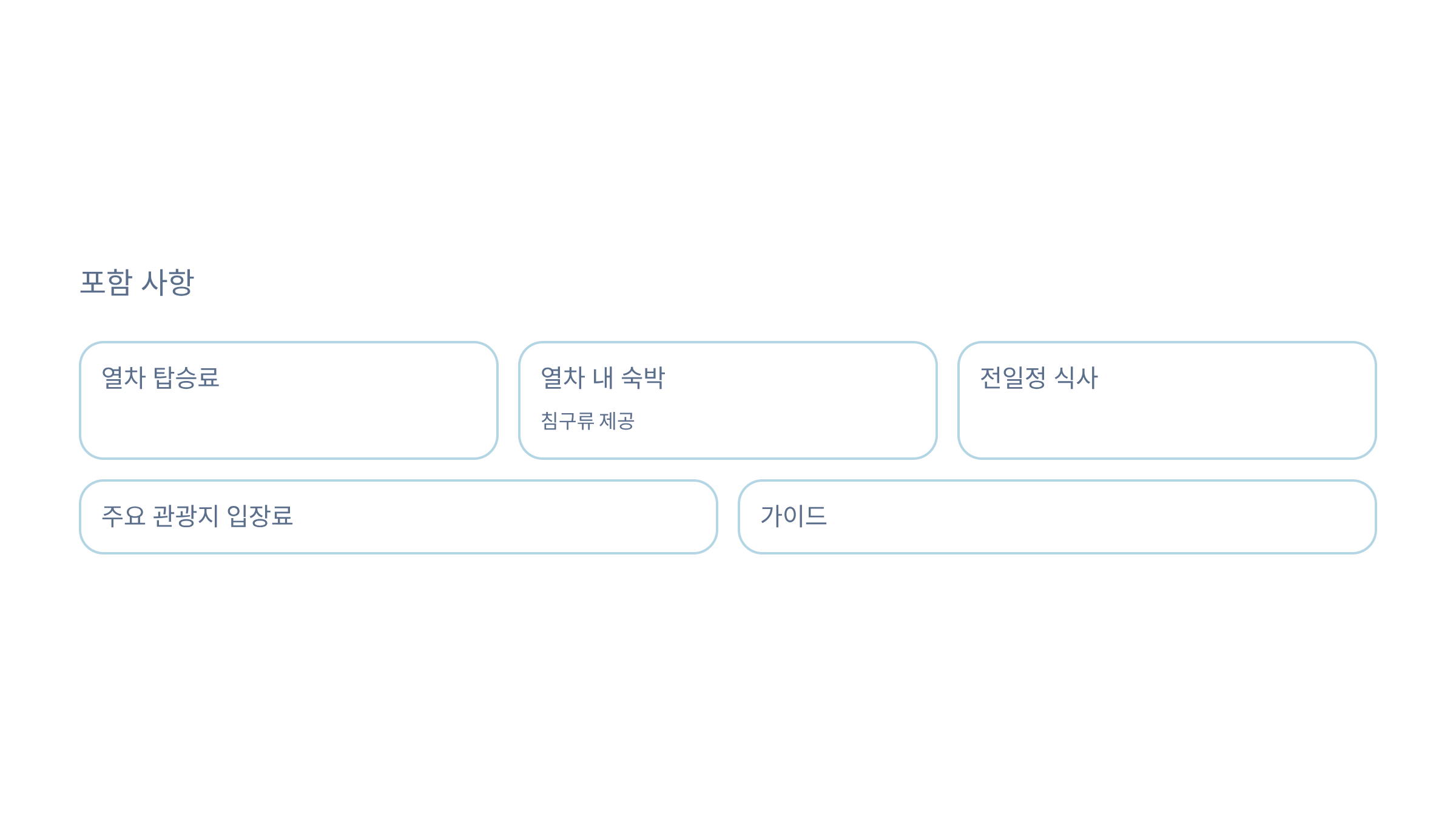 포함 사항: 기차비, 버스비, 숙박비, 전일정식사(4식), 모든 입장료