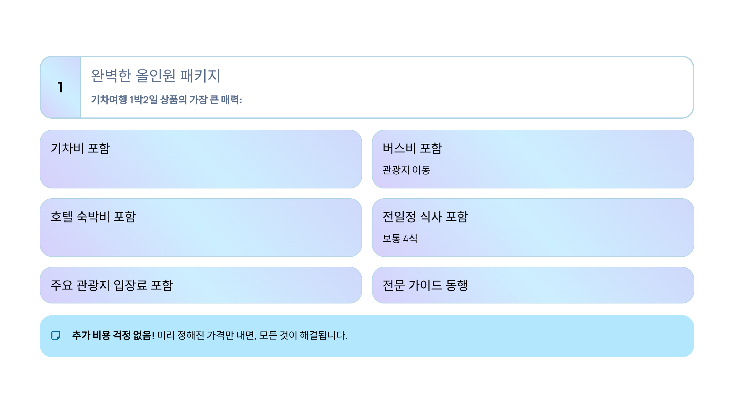 더욱 놀라운 것은 1박2일 패키지 여행상품입니다. 기차비, 버스비, 숙박비, 식사비, 입장료까지 모두 포함되어 있어서 추가 걱정 없이 순수하게 여행만 즐길 수 있습니다.