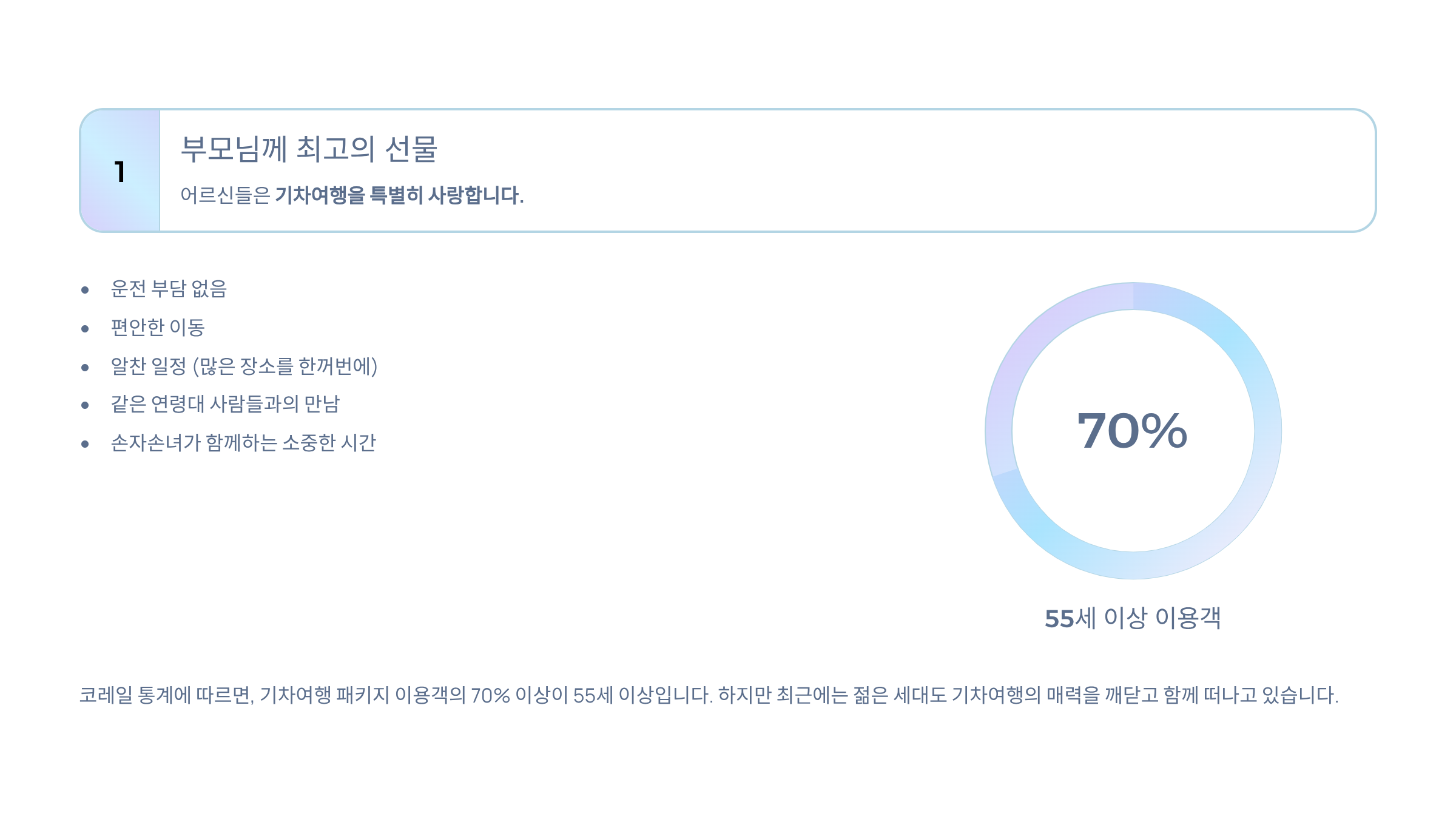 운전 스트레스 없이 편안하게, 부모님과 함께 소중한 추억을 만드세요! 기차 창밖으로 펼쳐지는 한반도의 아름다움을 감상하며, 당신의 인생 최고의 주말을 선물하세요.